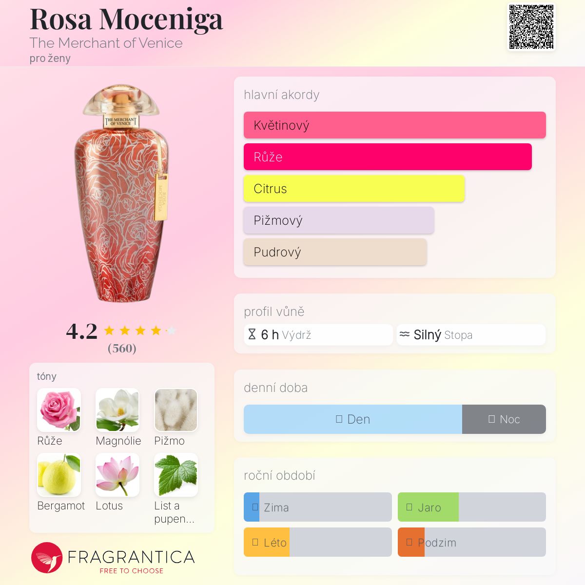 Rosa Moceniga podle The Merchant of Venice je Floral vůně pro ženy. Rosa Moceniga byl/a uveden/a v roce 2016. Vrchní tóny jsou Růže, Sicilský bergamot a Černý rybíz; střední tóny jsouRůže, Magnólie a Růžový lotos ; základní tóny jsou Růže, Pižmo, Vanilka, Křišťálový jantar a Extrakt z bílého cedru.