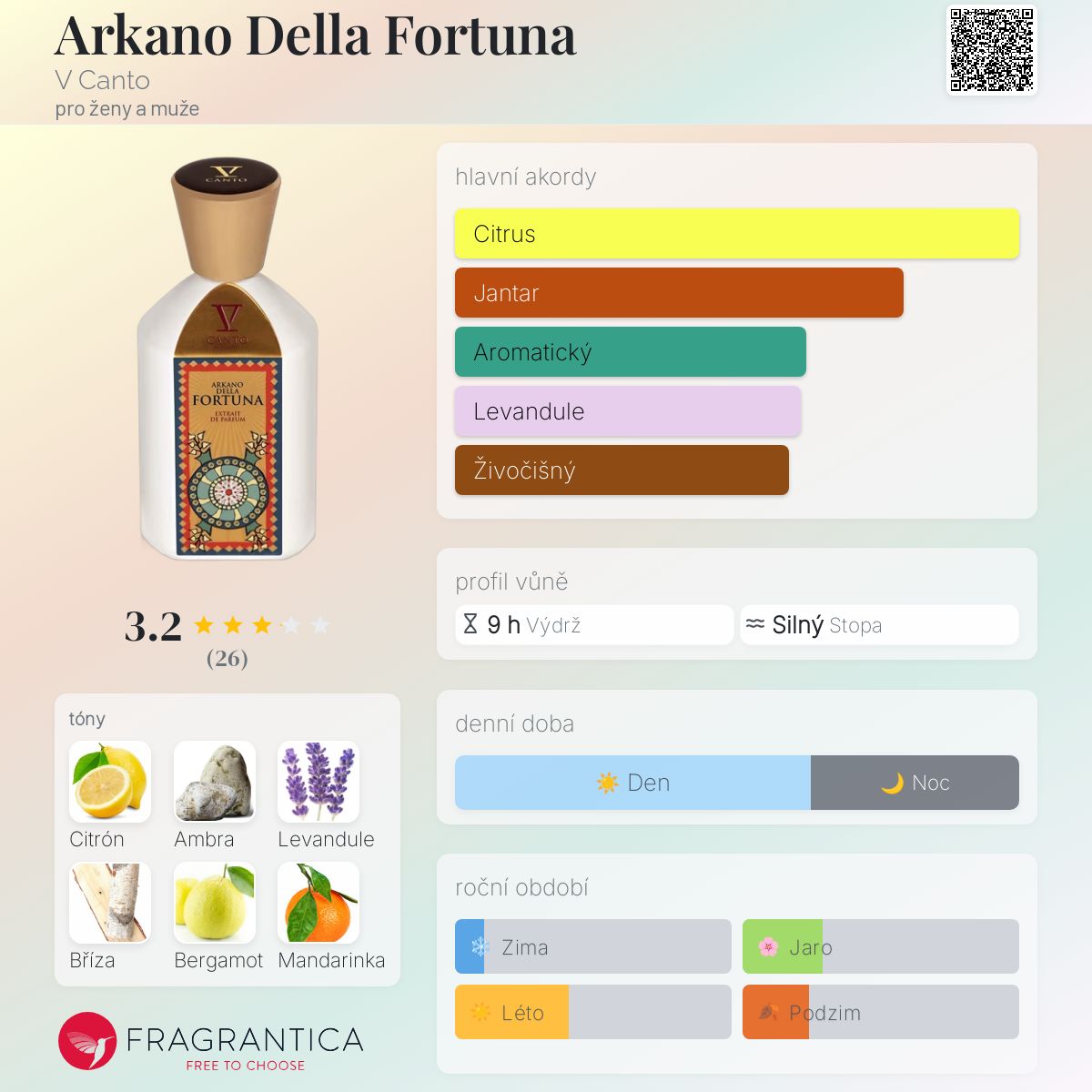 Arkano Della Fortuna podle V Canto je Citrus Aromatic vůně pro ženy a muže. Toto je nová vůně. Arkano Della Fortuna byl/a uveden/a v roce 2024. "Nosem" za touto vůní je Paolo Terenzi. Vrchní tóny jsou Citrón, Bergamot a Mandarinka; střední tóny jsouAmbra, Levandule a Jasmín Sambac ; základní tóny jsou Bříza, Pižmo, Balzám Tolu a Plumérie.