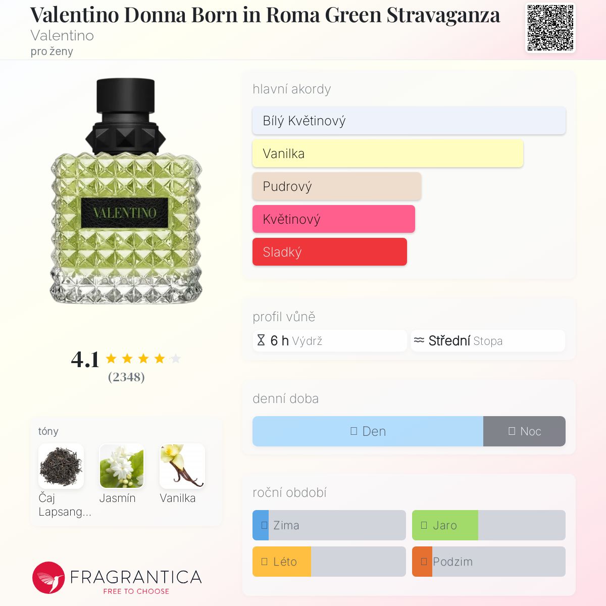 Valentino Donna Born in Roma Green Stravaganza podle Valentino je vůně pro ženy. Toto je nová vůně. Valentino Donna Born in Roma Green Stravaganza byl/a uveden/a v roce 2024. Vrchní tón je Čaj Lapsang souchong ; střední tón jeJasmín ; základní tón je Vanilka.