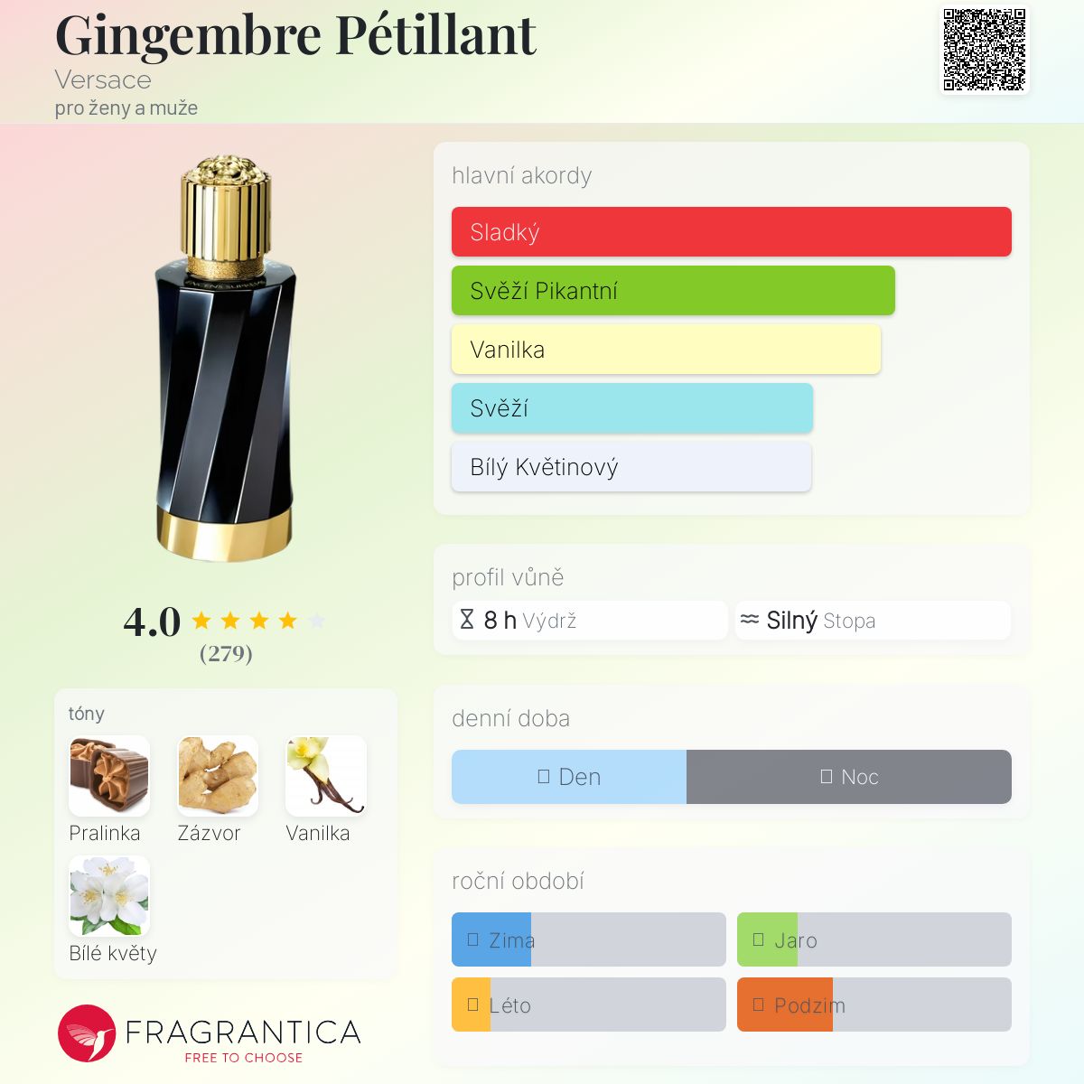Gingembre Pétillant podle Versace je Orientální Vanilla vůně pro ženy a muže. Gingembre Pétillant byl/a uveden/a v roce 2021. "Nosem" za touto vůní je Jordi Fernández. Vrchní tón je Zázvor ; střední tón jeBílé květy ; základní tóny jsou Pralinka a Vanilka.