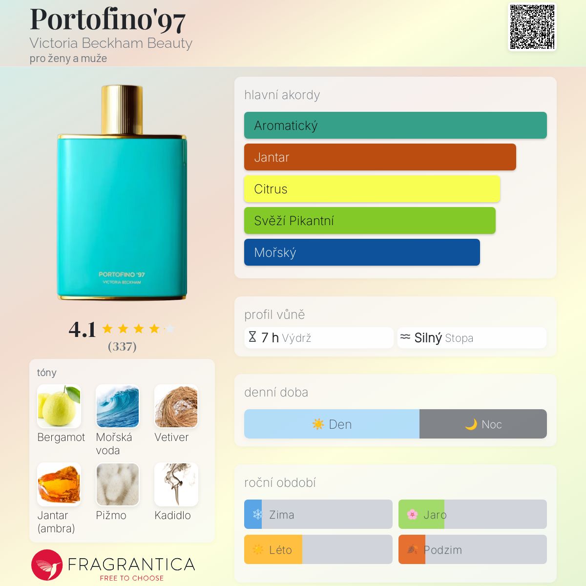 Portofino'97 podle Victoria Beckham Beauty je Woody Aquatic vůně pro ženy a muže. Portofino'97 byl/a uveden/a v roce 2023. "Nosem" za touto vůní je Jérôme Epinette. Vrchní tóny jsou Kalábrijský bergamot a Černý pepř; střední tóny jsouMořské tóny, Jantar (ambra) a Kadidlo ; základní tóny jsou Vetiver, Pižmo a Pačuli.