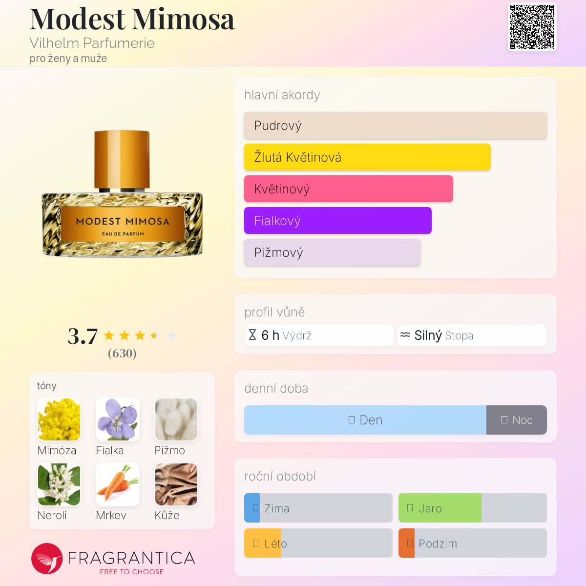 Modest Mimosa podle Vilhelm Parfumerie je Floral vůně pro ženy a muže. Modest Mimosa byl/a uveden/a v roce 2016. "Nosem" za touto vůní je Jérôme Epinette. Vrchní tóny jsou Neroli a Mrkev; střední tóny jsouMimóza a Fialka ; základní tóny jsou Pižmo a Kůže.