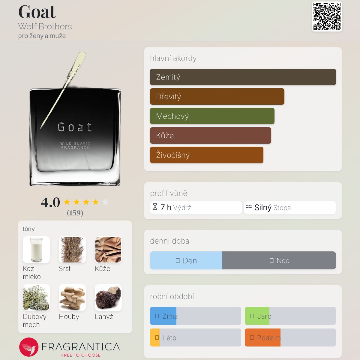 Voní jako mokrá kožešina smíchaná s uzenou, spálenou kožešinou, to vše dohromady smíchané s kořením a zabalené do zvláštního umami-mléčného mechově zeleného kabátu. Po nějaké době se také objeví fialový list a ukáže svou přítomnost. Dohromady velmi unikátní a nic na trhu, co znám, nevoní jako Goat od Wolf Brothers.