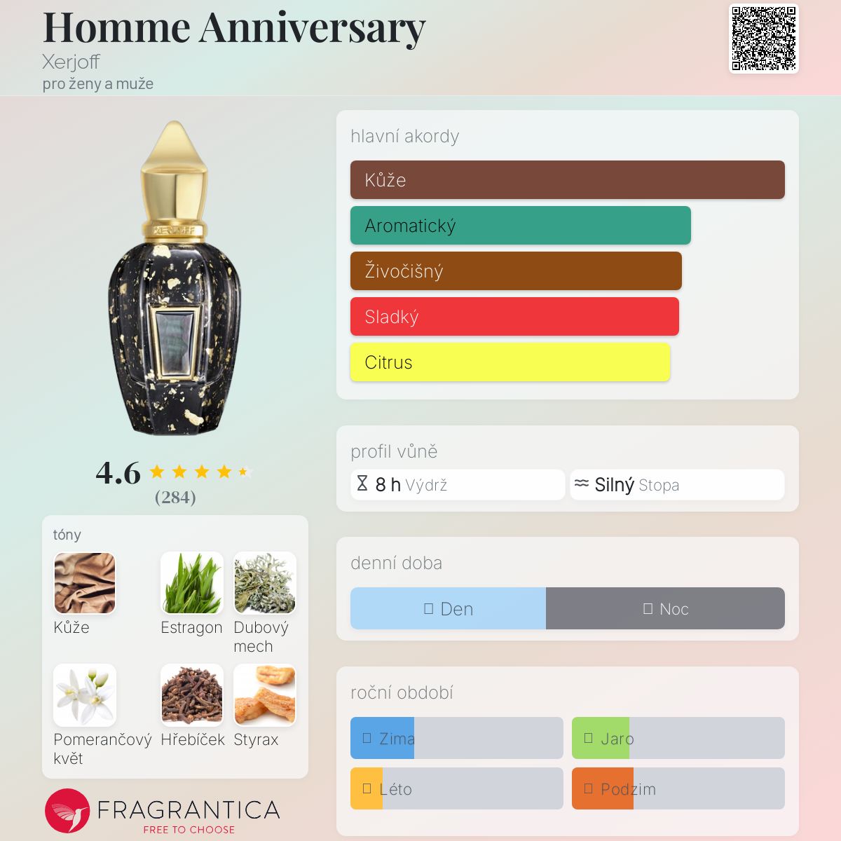 Homme Anniversary podle Xerjoff je Leather vůně pro ženy a muže. Toto je nová vůně. Homme Anniversary byl/a uveden/a v roce 2024. Vrchní tóny jsou Estragon, Citrón a Bergamot; střední tóny jsouKůže, Pomerančový květ, Hřebíček a Fazole tonka ; základní tóny jsou Mech, Styrax, Kandované ovoce a Vanilka.