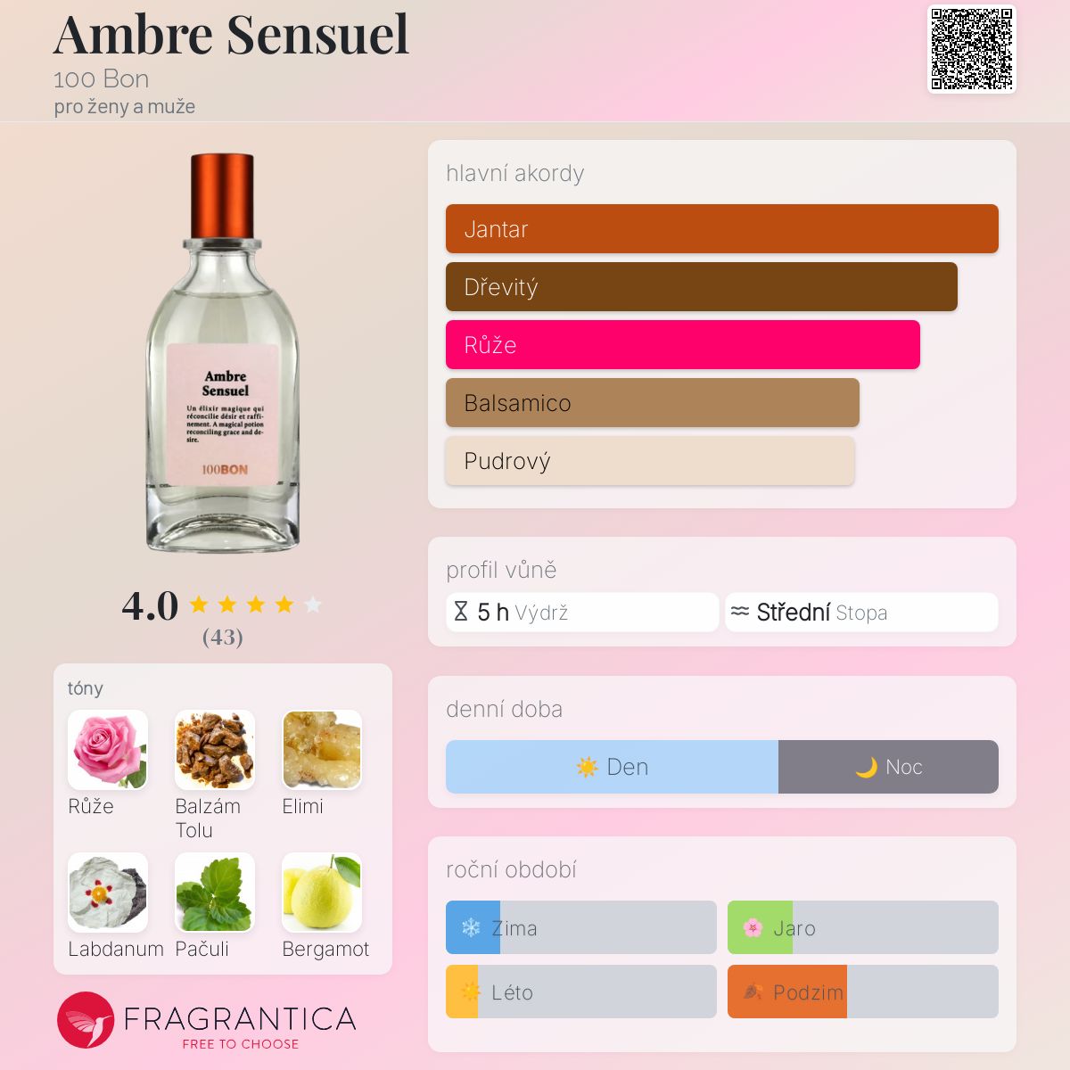 Ambre Sensuel podle 100 Bon je Chypre Floral vůně pro ženy a muže. Ambre Sensuel byl/a uveden/a v roce 2018. "Nosem" za touto vůní je Serge de Oliveira. Vrchní tóny jsou Elimi a Bergamot; střední tóny jsouRůže, Labdanum a Guajakové dřevo ; základní tóny jsou Balzám Tolu, Pačuli, Cedr a Kůže.