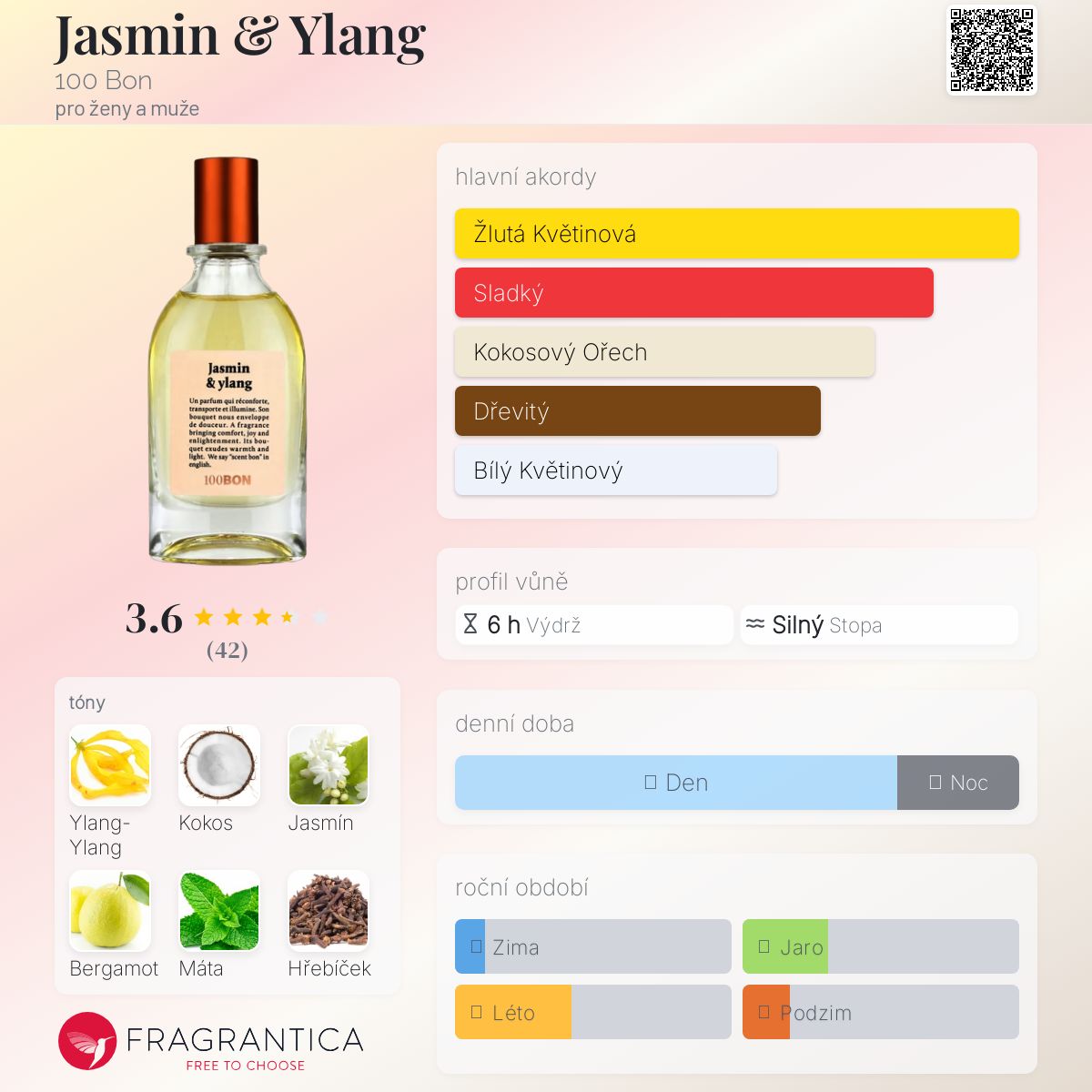 Jasmin & Ylang podle 100 Bon je Orientální Floral vůně pro ženy a muže. Jasmin & Ylang byl/a uveden/a v roce 2017. "Nosem" za touto vůní je Serge de Oliveira. Vrchní tóny jsou Kokos, Bergamot, Máta a Krvavý pomeranč; střední tóny jsouYlang-Ylang, Jasmín, Hřebíček a Růže ; základní tóny jsou Vanilka, Benzoin, Plumérie a Virginský cedr.