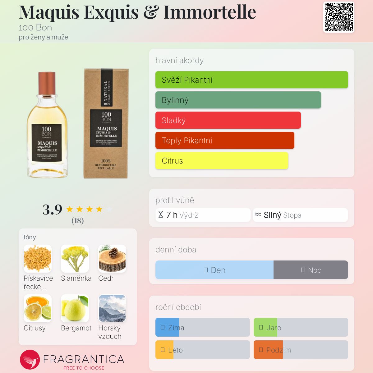 Maquis Exquis & Immortelle podle 100 Bon je vůně pro ženy a muže. "Nosem" za touto vůní je Karine Vinchon Spehner. Vrchní tóny jsou Citrusy, Bergamot a Horský vzduch; střední tóny jsouPískavice řecké seno a Slaměnka ; základní tóny jsou Virginský cedr a Pačuli.