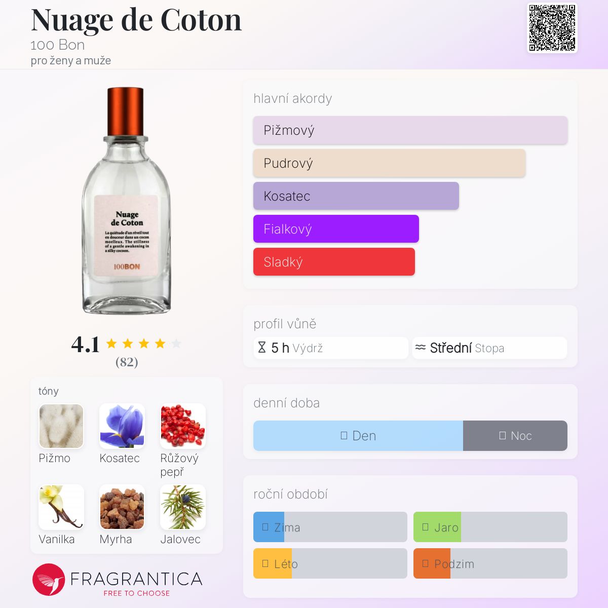 Nuage de Coton podle 100 Bon je Floral Woody Musk vůně pro ženy a muže. Nuage de Coton byl/a uveden/a v roce 2018. "Nosem" za touto vůní je Amandine Galliano. Vrchní tóny jsou Růžový pepř, Jalovec a Pelyněk; střední tóny jsouKosatec, Myrha a Kadidlo ; základní tóny jsou Pižmo a Vanilka.