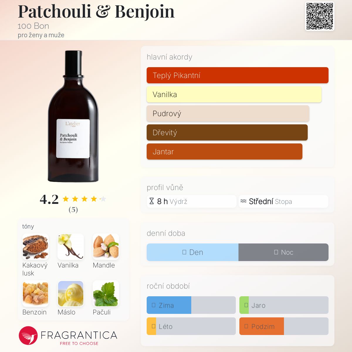 Patchouli & Benjoin podle 100 Bon je Orientální Woody vůně pro ženy a muže. Toto je nová vůně. Patchouli & Benjoin byl/a uveden/a v roce 2025. "Nosem" za touto vůní je Karine Vinchon Spehner. Vrchní tóny jsou Mandle, Pudrové tóny a Pelargónie; střední tóny jsouKakao, Benzoin, Máslo, Jantar (ambra) a Růže ; základní tóny jsou Vanilka, Pačuli, Virginský cedr, Santalové dřevo a Pižmo.