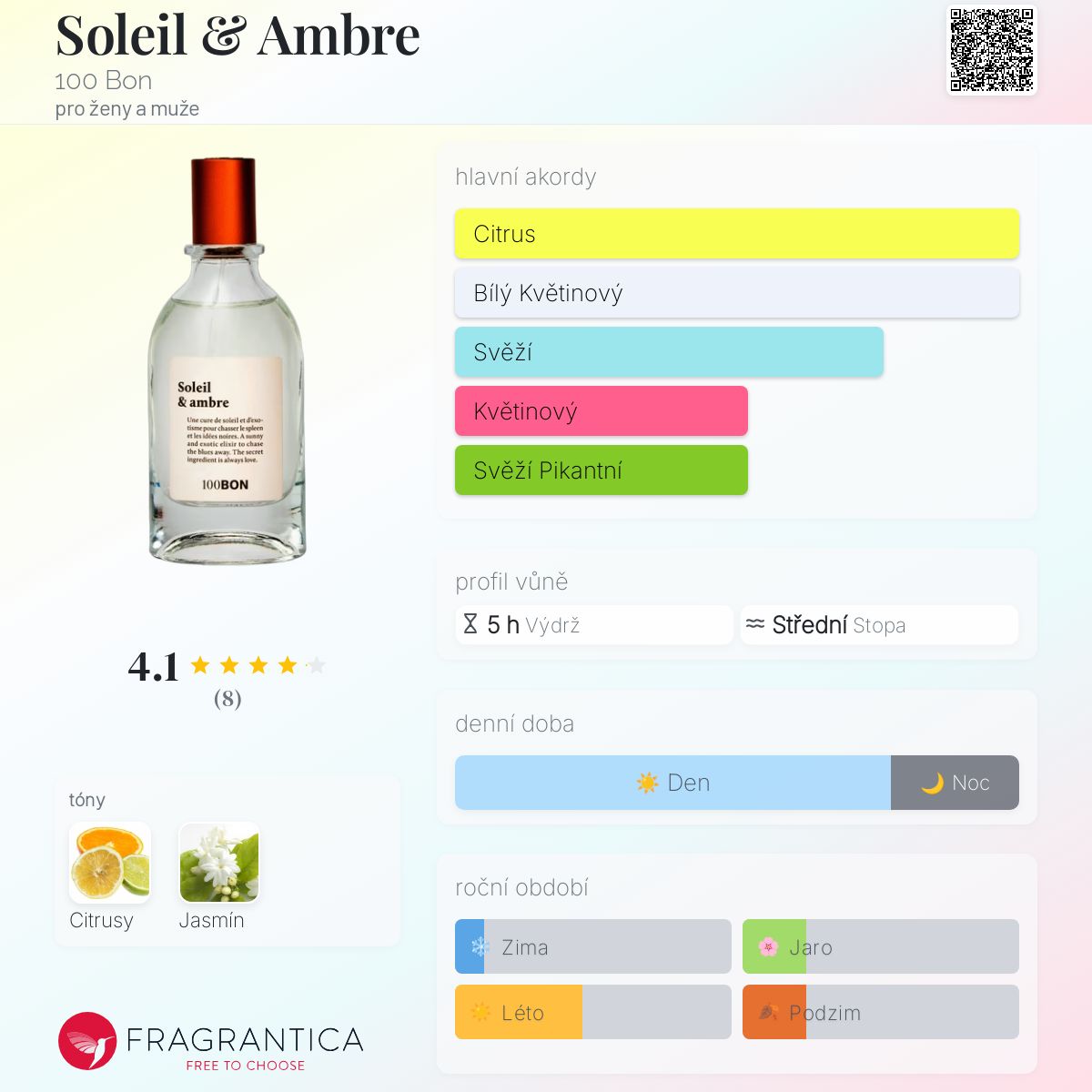 Soleil & Ambre podle 100 Bon je vůně pro ženy a muže. Soleil & Ambre byl/a uveden/a v roce 2018. Vrchní tón je Citrusy ; střední tón jeJasmín ;