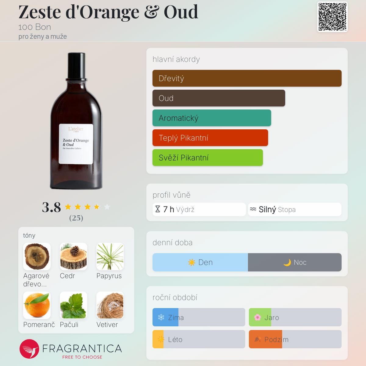 Zeste d'Orange & Oud podle 100 Bon je Orientální Woody vůně pro ženy a muže. Toto je nová vůně. Zeste d'Orange & Oud byl/a uveden/a v roce 2024. "Nosem" za touto vůní je Amandine Galliano. Vrchní tóny jsou Pomeranč, Kardamom, Růžový pepř a Kadidlo; střední tóny jsouVirginský cedr, Papyrus, Pačuli a Pelargónie ; základní tóny jsou Agarové dřevo (oud), Vetiver, Siamský (thajský) benzoin a Pižmo.