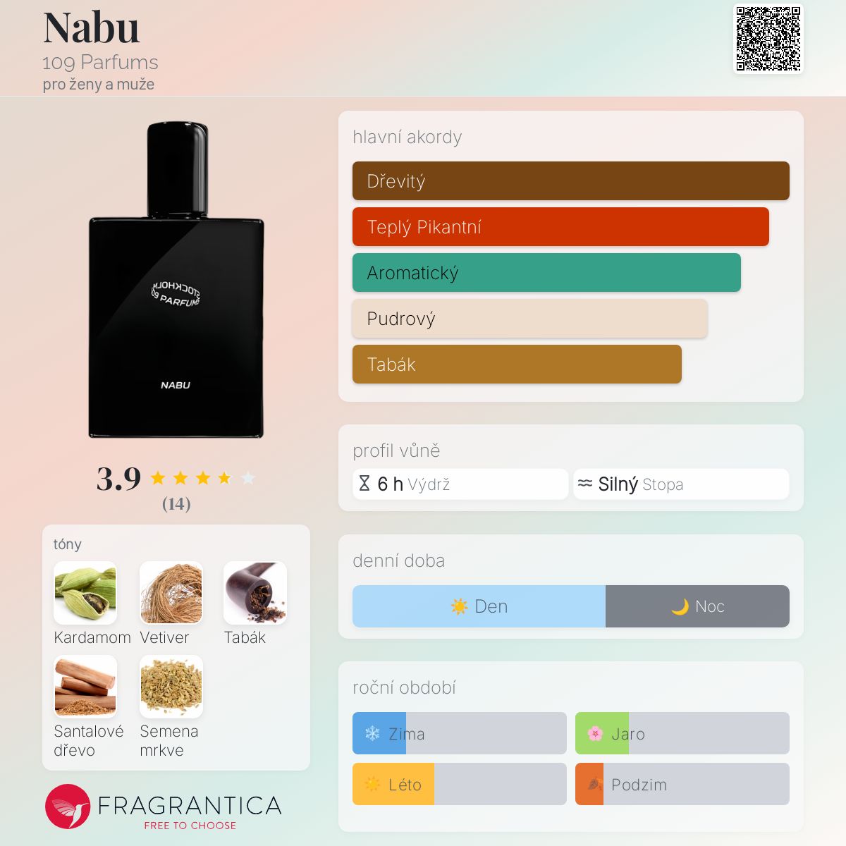 Nabu podle 109 Parfums je Woody Spicy vůně pro ženy a muže. Nabu byl/a uveden/a v roce 2018. "Nosem" za touto vůní je Patrick David. Vrchní tóny jsou Kardamom a Semena mrkve; střední tóny jsouVetiver a Tabák ; základní tón je Santalové dřevo.