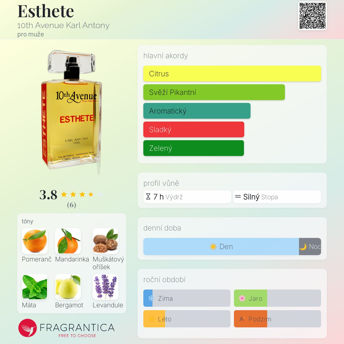 Esthete podle 10th Avenue Karl Antony je Orientální Fougere vůně pro muže. Vrchní tóny jsou Pomeranč, Mandarinka, Bergamot, Grapefruit a Růžový pepř; střední tóny jsouMuškátový oříšek, Máta, Levandule a Jasmín ; základní tóny jsou Fazole tonka, Jantar (ambra), Santalové dřevo, Vzácné dřevo, Vanilka a Pižmo.