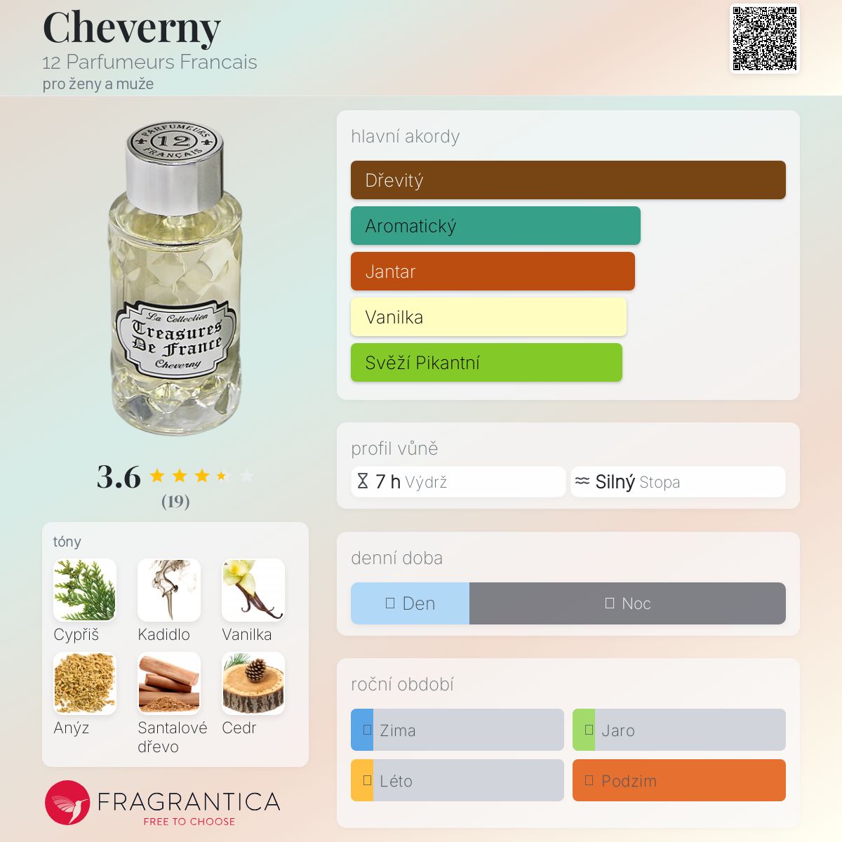 Cheverny podle 12 Parfumeurs Francais je vůně pro ženy a muže. Cheverny byl/a uveden/a v roce 2015. Vrchní tóny jsou Cypřiš, Anýz a Pepř; střední tóny jsouKadidlo a Pomeranč ; základní tóny jsou Vanilka, Santalové dřevo, Cedr a Pižmo.
