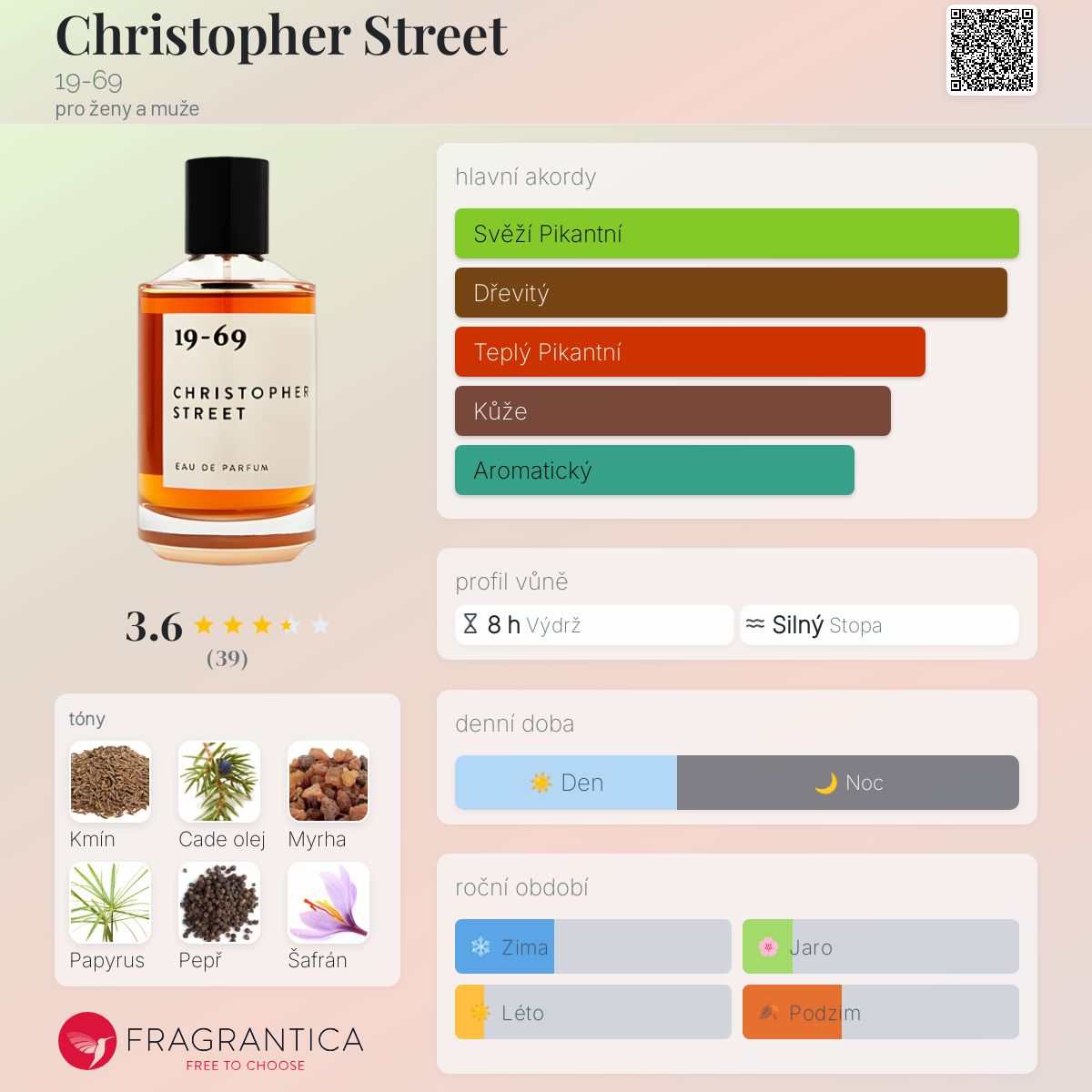Christopher Street podle 19-69 je vůně pro ženy a muže. Christopher Street byl/a uveden/a v roce 2021. Vrchní tóny jsou Černý pepř a Šafrán; střední tóny jsouŘímský kmín a List indonéského pačuli ; základní tóny jsou Cade olej, Myrha, Papyrus a Kastoreum.
