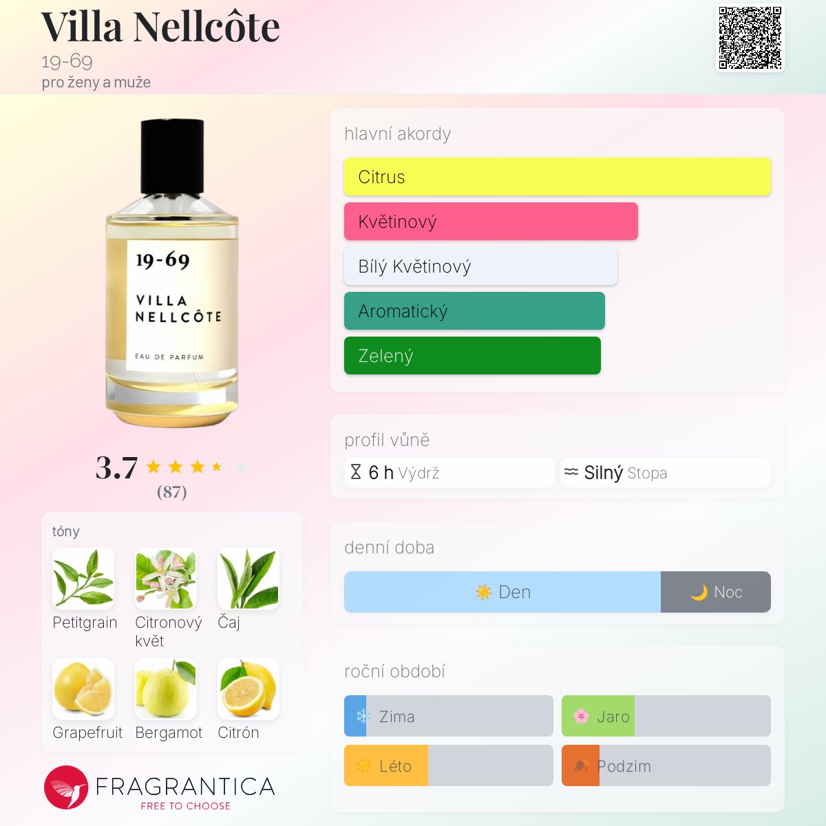 Villa Nellcôte podle 19-69 je Floral Woody Musk vůně pro ženy a muže. Villa Nellcôte byl/a uveden/a v roce 2019. Vrchní tóny jsou Petitgrain, Citronový květ, Grapefruit, Bergamot, Citrón, Elimi a Růžový pepř; střední tóny jsouČerný čaj, Růže, Vonokvětka, Magnólie, Jasmín a Fialka ; základní tóny jsou Pižmo, Cedr, Bílý jantar (ambra), Mech, Cabreuva, Pačuli a Guajakové dřevo.