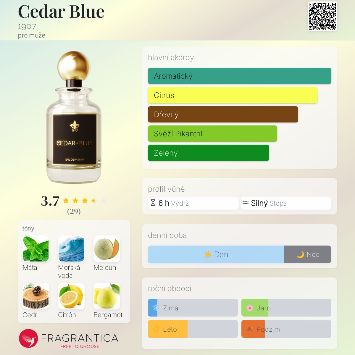 Cedar Blue podle 1907 je Woody Aromatic vůně pro muže. Cedar Blue byl/a uveden/a v roce 2020. Vrchní tóny jsou Pikantní máta, Citrón, Bergamot, Grapefruit, Tymián a Mandarinka; střední tóny jsouMořská voda, Meloun a Aldehydy ; základní tóny jsou Cedr, Pačuli, Santalové dřevo, Dubový mech a Jantar (ambra).