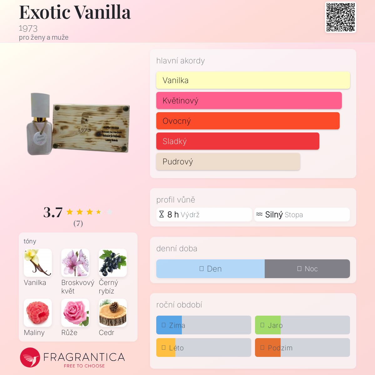 Exotic Vanilla podle 1973 je vůně pro ženy a muže. "Nosem" za touto vůní je Rosario Cerullo. Vrchní tóny jsou Černý rybíz, Maliny, Sladký pomeranč a Kokos; střední tóny jsouBroskvový květ, Bulharská růže, Orchidej a Jasmín Sambac ; základní tóny jsou Bourbonská vanilka, Cedr, Pižmo, Med a Benzoin.