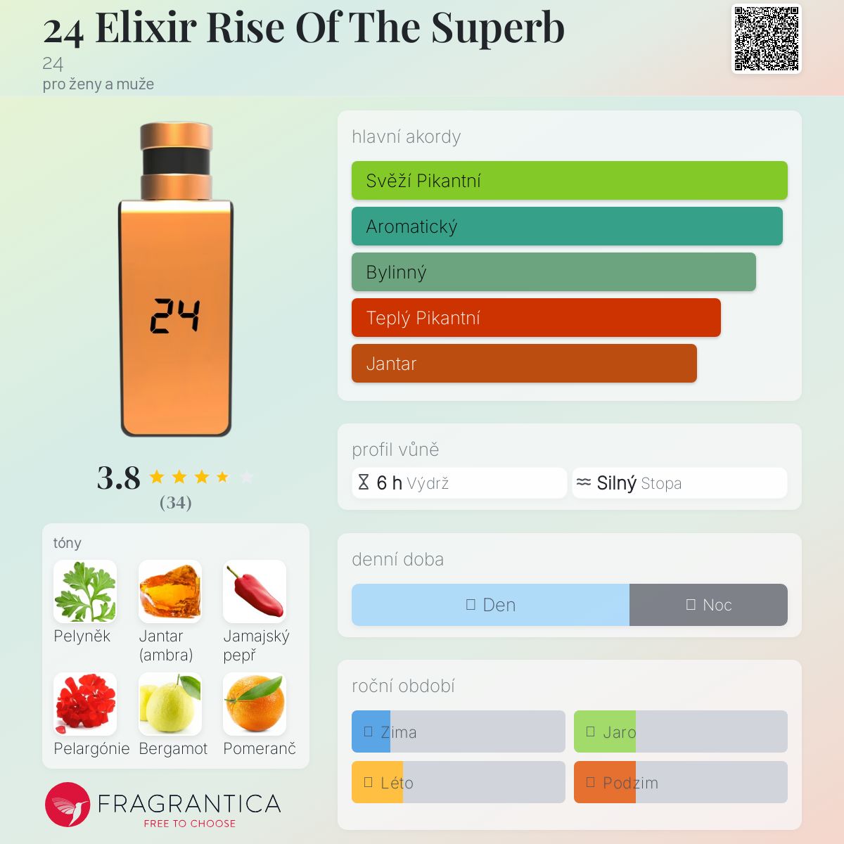 24 Elixir Rise Of The Superb podle 24 je Woody Spicy vůně pro ženy a muže. 24 Elixir Rise Of The Superb byl/a uveden/a v roce 2019. 24 Elixir Rise Of The Superb byl/a vytvořen/a Irina Burlakova, Dalia Izem a Nanako Ogi. Vrchní tóny jsou Pelyněk, Bergamot a Pomeranč; střední tóny jsouČervená chilli paprička, Pelargónie a Pomerančový květ ; základní tóny jsou Jantar (ambra), Pačuli a Vetiver.