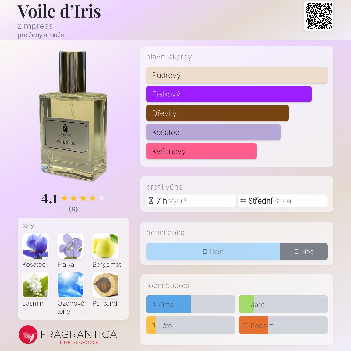 Voile d’Iris podle 2impress je vůně pro ženy a muže. Voile d’Iris byla spuštěna během 2022. Vrchní tóny jsou Bergamot a Ozonové tóny; střední tóny jsouKosatec, Fialka, Jasmín a Texaský palisandr ; základní tóny jsou Santalové dřevo a Pižmo.