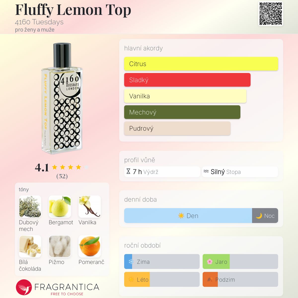 Fluffy Lemon Top podle 4160 Tuesdays je Floral vůně pro ženy a muže. Fluffy Lemon Top byl/a uveden/a v roce 2020. "Nosem" za touto vůní je Sarah McCartney. Vrchní tóny jsou Bergamot, Pomeranč a Mandarinka; střední tóny jsouBílá čokoláda, Kosatec, Narcis a Konvalinka ; základní tóny jsou Mech, Vanilka, Pižmo a Fazole tonka.