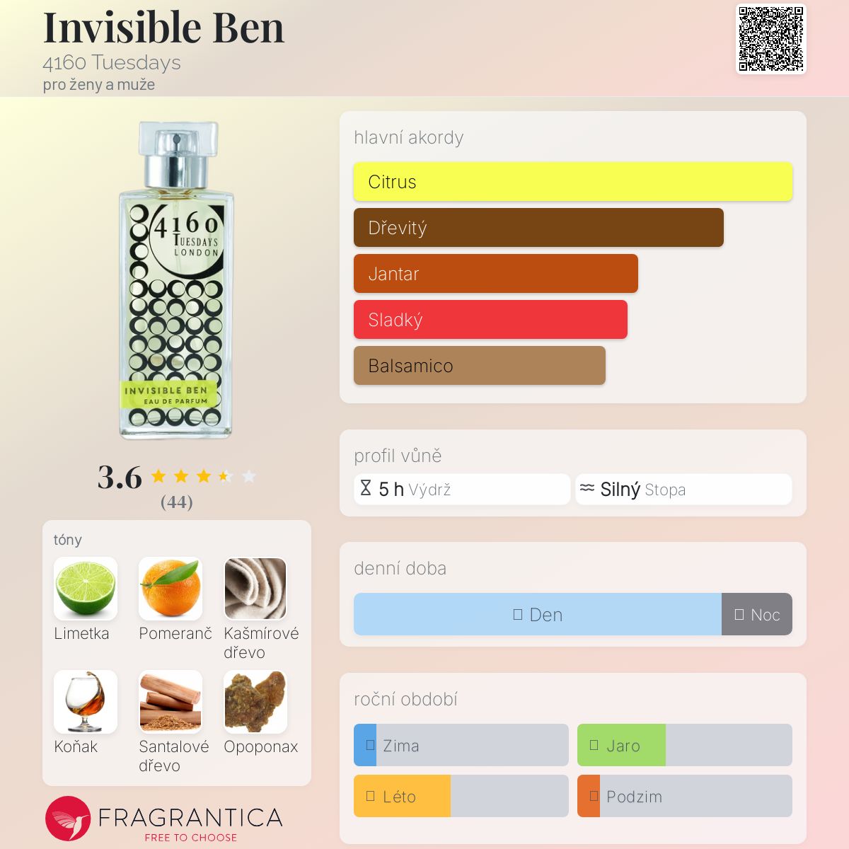 Invisible Ben podle 4160 Tuesdays je Woody vůně pro ženy a muže. Invisible Ben byl/a uveden/a v roce 2014. "Nosem" za touto vůní je Sarah McCartney. Vrchní tóny jsou Limetka, Pomeranč a Koňak; střední tóny jsouKašmírové dřevo, Santalové dřevo a Káva ; základní tóny jsou Opoponax a Pryskyřice.