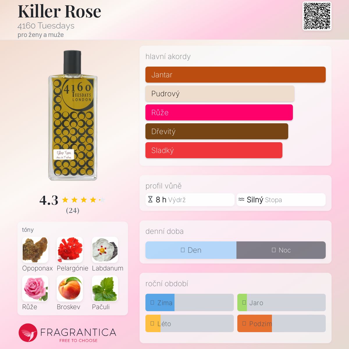 Killer Rose podle 4160 Tuesdays je Floral vůně pro ženy a muže. Killer Rose byl/a uveden/a v roce 2018. "Nosem" za touto vůní je Sarah McCartney. Vrchní tóny jsou Broskev a Yuzu; střední tóny jsouPelargónie, Růže, Fialka, Kosatec a Jasmín ; základní tóny jsou Opoponax, Labdanum, Pačuli a Pižmo.