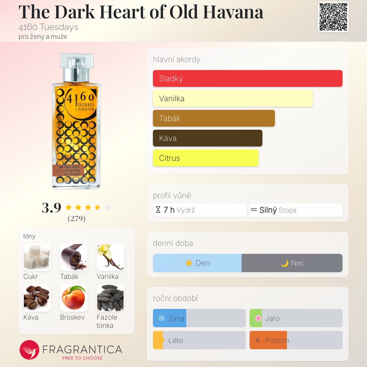 The Dark Heart of Old Havana podle 4160 Tuesdays je Orientální Spicy vůně pro ženy a muže. The Dark Heart of Old Havana byl/a uveden/a v roce 2013. "Nosem" za touto vůní je Sarah McCartney. Vrchní tóny jsou Cukr, Broskev, Pomeranč a Grapefruit; střední tóny jsouTabák, Káva, Fazole tonka, Jasmín a Bergamot ; základní tóny jsou Vanilka, Pižmo a Černý pepř.