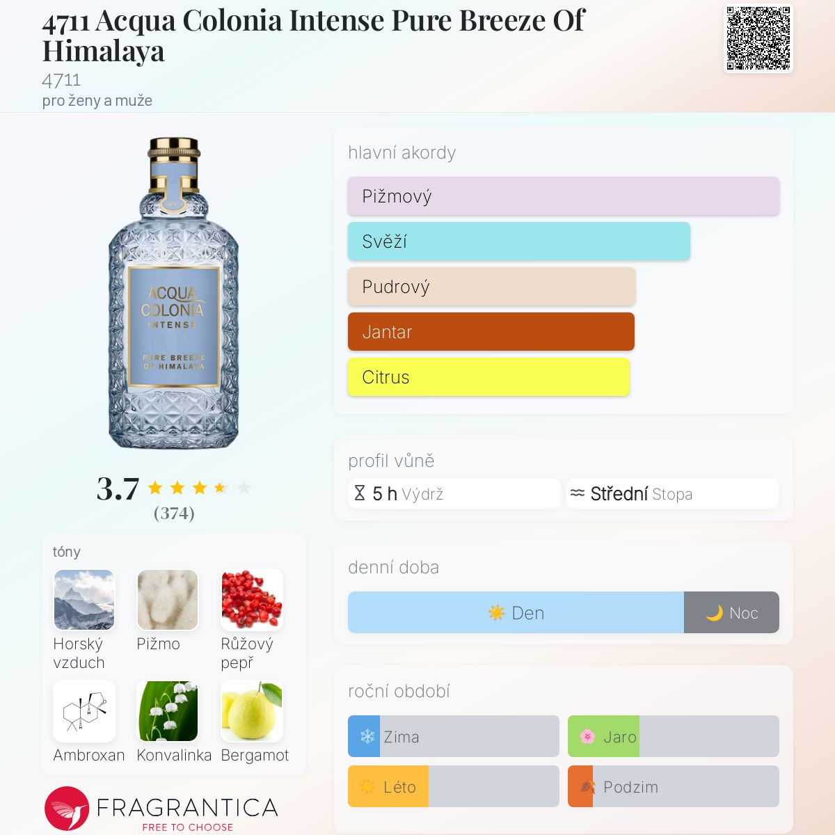 4711 Acqua Colonia Intense Pure Breeze Of Himalaya podle 4711 je Aromatic vůně pro ženy a muže. 4711 Acqua Colonia Intense Pure Breeze Of Himalaya byl/a uveden/a v roce 2019. "Nosem" za touto vůní je Fanny Bal. Vrchní tóny jsou Růžový pepř, Bergamot a Mandarinka; střední tóny jsouHorský vzduch, Konvalinka a Růže ; základní tóny jsou Pižmo, Ambroxan a Kašmír.