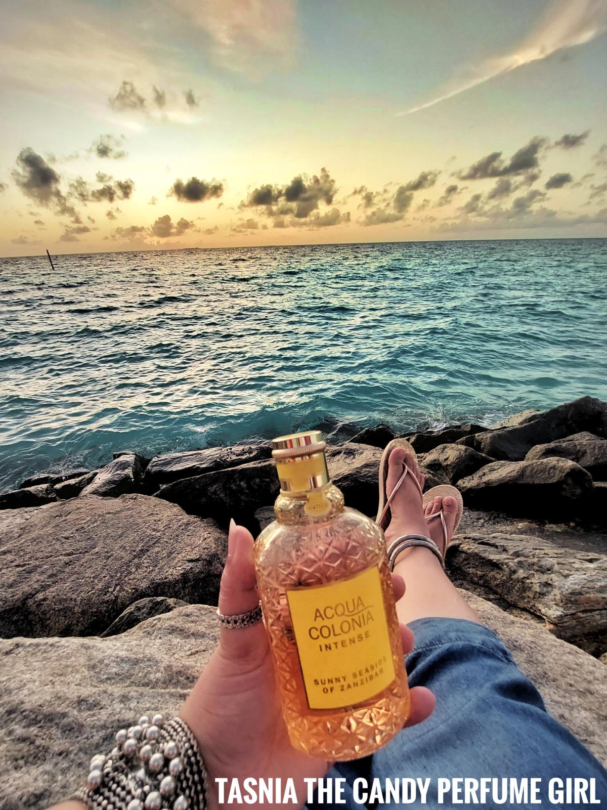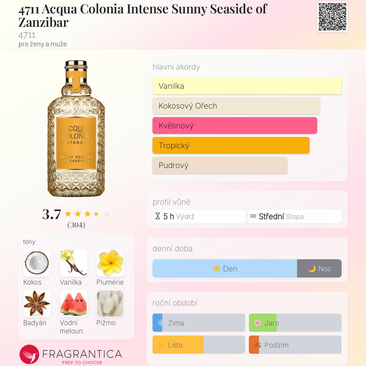 4711 Acqua Colonia Intense Sunny Seaside of Zanzibar podle 4711 je Orientální Floral vůně pro ženy a muže. 4711 Acqua Colonia Intense Sunny Seaside of Zanzibar byl/a uveden/a v roce 2019. "Nosem" za touto vůní je Daphné Bugey. Vrchní tóny jsou Badyán a Vodní meloun; střední tóny jsouKokos, Plumérie a Pižmo ; základní tóny jsou Vanilka, Vetiver a Cedr.
