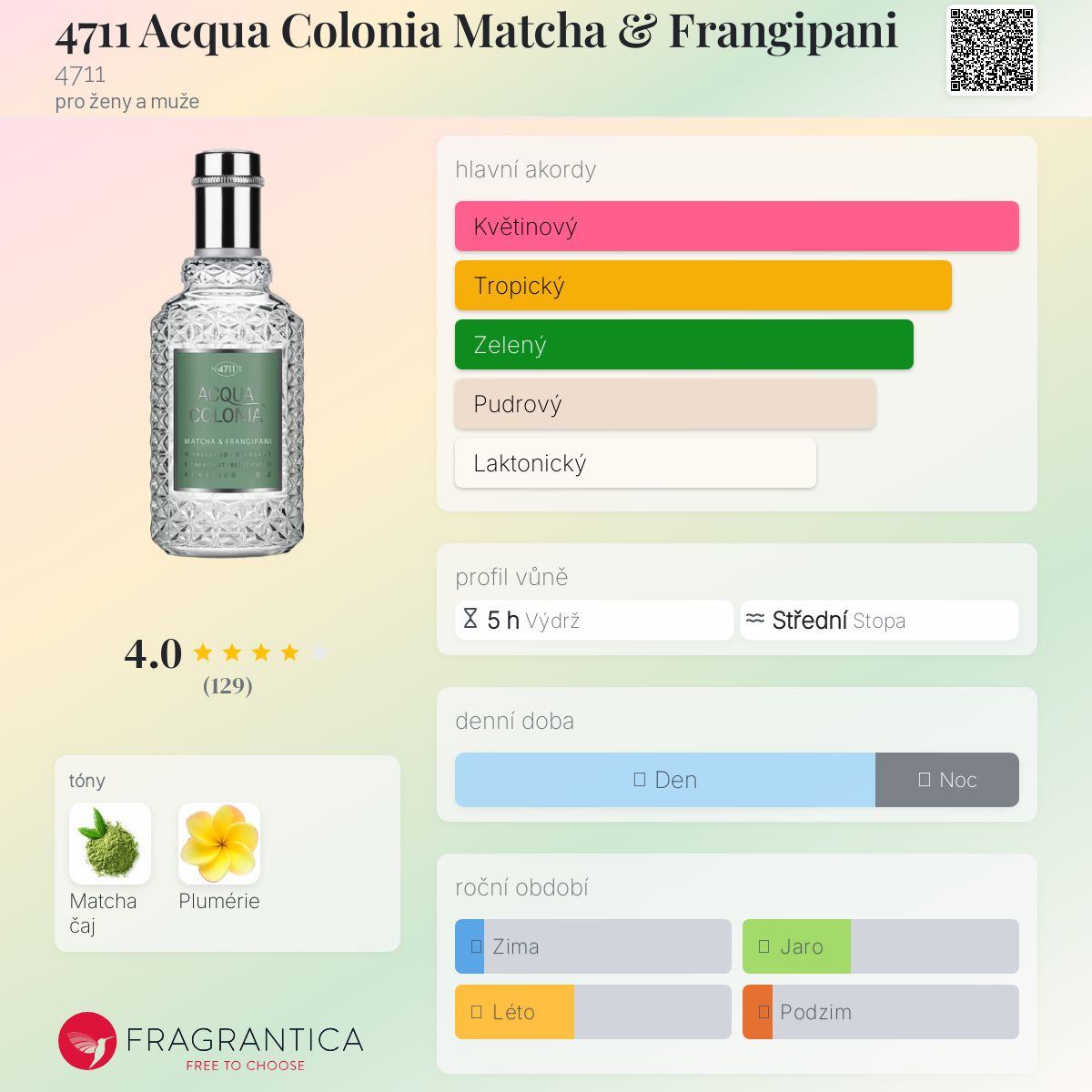 4711 Acqua Colonia Matcha & Frangipani podle 4711 je Aromatic vůně pro ženy a muže. 4711 Acqua Colonia Matcha & Frangipani byl/a uveden/a v roce 2020. "Nosem" za touto vůní je Mathieu Nardin.
