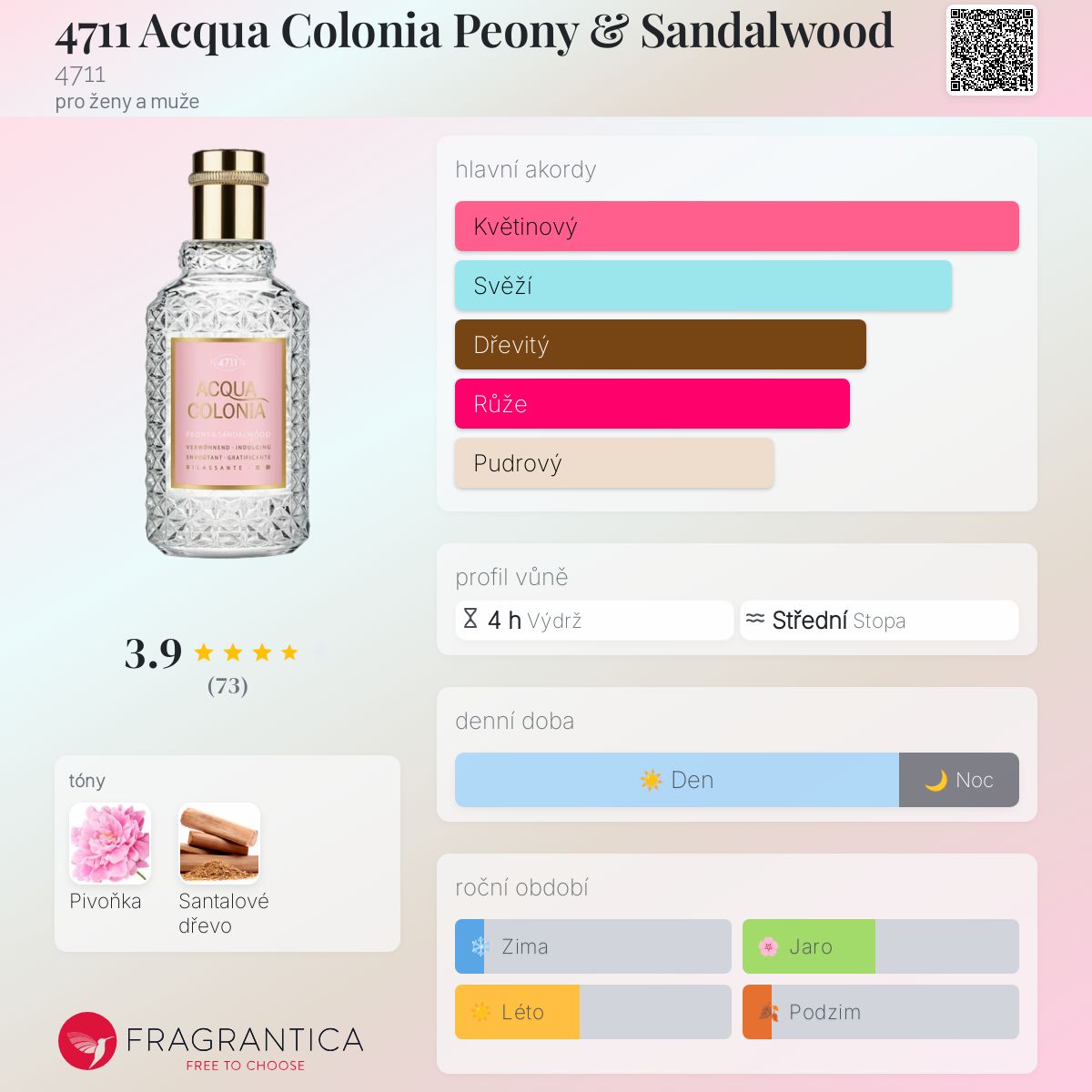 4711 Acqua Colonia Peony & Sandalwood podle 4711 je Floral Woody Musk vůně pro ženy a muže. 4711 Acqua Colonia Peony & Sandalwood byl/a uveden/a v roce 2023. "Nosem" za touto vůní je Fanny Bal.