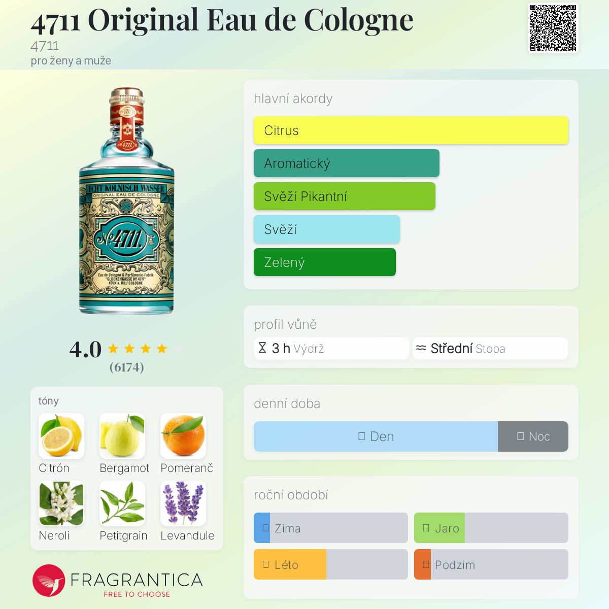 4711 Original Eau de Cologne podle 4711 je Citrus Aromatic vůně pro ženy a muže. 4711 Original Eau de Cologne byl/a uveden/a v roce 1792. "Nosem" za touto vůní je Wilhelm Muelhens. Vrchní tóny jsou Citrón, Bergamot a Pomeranč; střední tóny jsouLevandule a Rozmarýn ; základní tóny jsou Neroli a Petitgrain.