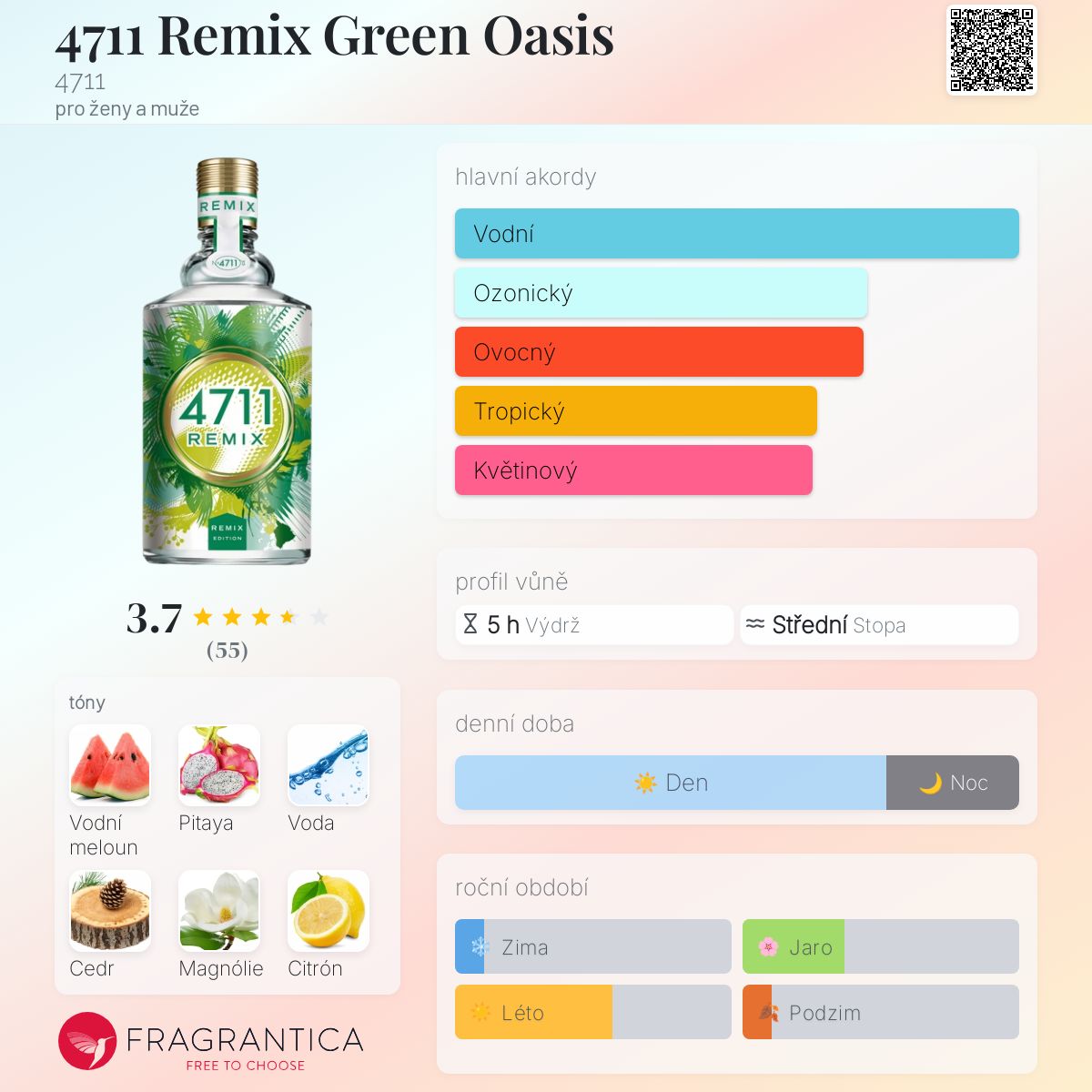 4711 Remix Green Oasis podle 4711 je vůně pro ženy a muže. Toto je nová vůně. 4711 Remix Green Oasis byl/a uveden/a v roce 2024. "Nosem" za touto vůní je Angéline Leporini. Vrchní tóny jsou Vodní meloun, Pitaya a Citrón; střední tóny jsouVodní tóny, Magnólie, Gardénie a Švestka ; základní tóny jsou Cedr, Santalové dřevo a Pižmo.