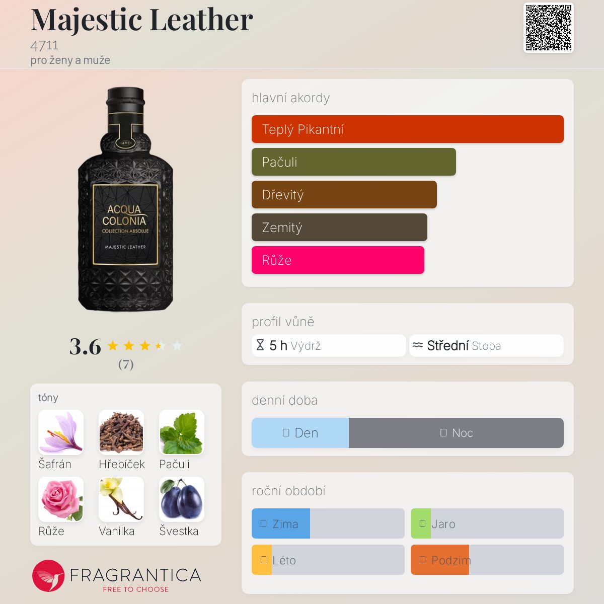Majestic Leather podle 4711 je vůně pro ženy a muže. Majestic Leather byl/a uveden/a v roce 2023. "Nosem" za touto vůní je Julien Rasquinet. Vrchní tóny jsou Šafrán, Hřebíček a Švestka; střední tóny jsouRůže, Tabák a Cypriolový olej ; základní tóny jsou Pačuli, Vanilka a Kůže.
