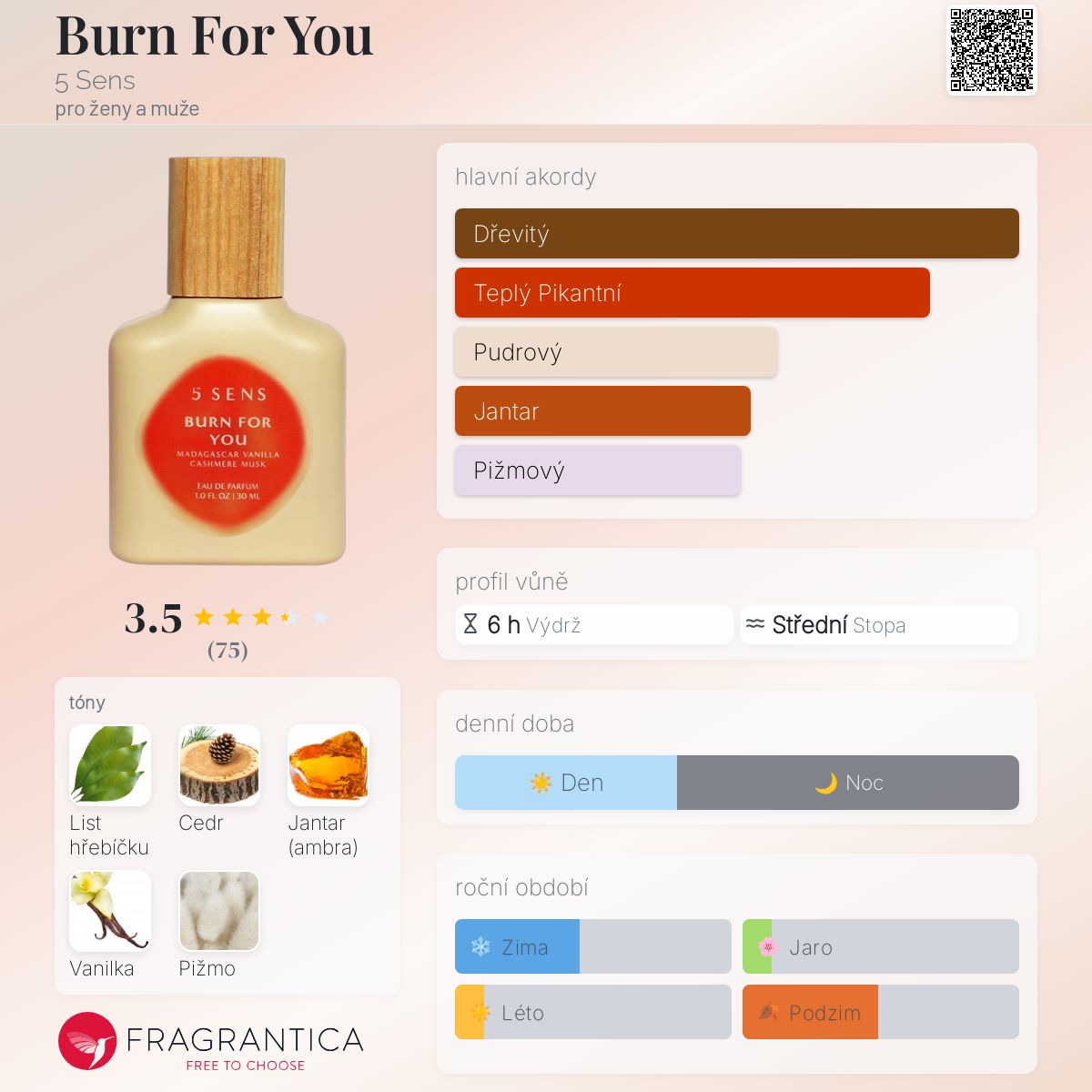 Burn For You podle 5 Sens je Orientální Vanilla vůně pro ženy a muže. Burn For You byl/a uveden/a v roce 2023.