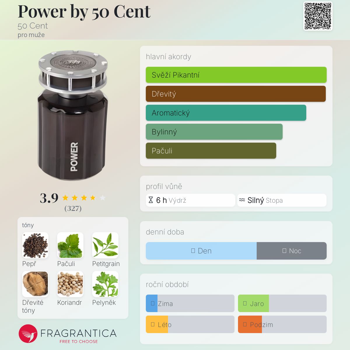 Power by 50 Cent podle 50 Cent je Aromatic Spicy vůně pro muže. Power by 50 Cent byl/a uveden/a v roce 2009. "Nosem" za touto vůní je Harry Fremont. Vrchní tóny jsou Pepř, Petitgrain a Pelyněk; střední tóny jsouDřevité tóny, Koriandr a Muškátový oříšek ; základní tóny jsou Pačuli, Pižmo a Dubový mech.