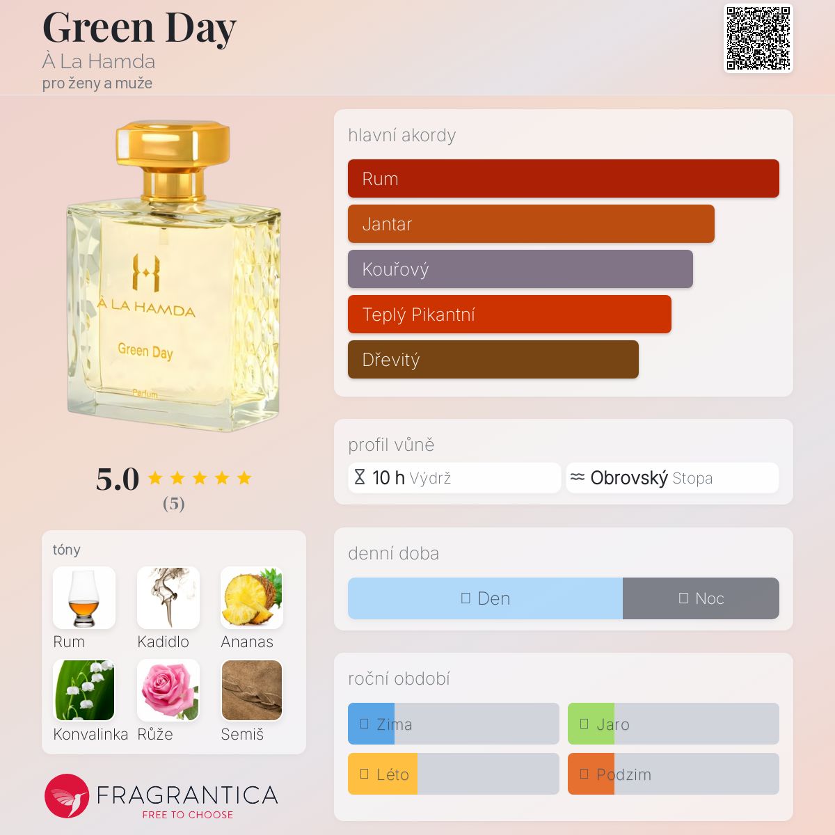 Green Day podle À La Hamda je Orientální Floral vůně pro ženy a muže. Toto je nová vůně. Green Day byl/a uveden/a v roce 2025. "Nosem" za touto vůní je Mohamed Mandouh. Vrchní tóny jsou Ananas, Grapefruit, Bergamot a Citrón; střední tóny jsouKonvalinka, Růže, Frézie a Jablko ; základní tóny jsou Rum, Kadidlo, Semiš, Pačuli, Vanilka, Cedr a Jantar (ambra).