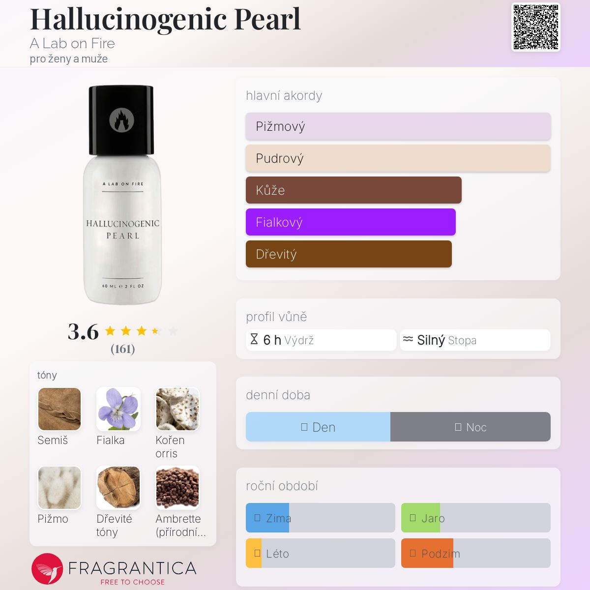 Hallucinogenic Pearl podle A Lab on Fire je Orientální Spicy vůně pro ženy a muže. Hallucinogenic Pearl byl/a uveden/a v roce 2018. "Nosem" za touto vůní je Emilie Coppermann. Vrchní tóny jsou Ambrette (přírodní pižmo), Růžový pepř a Bergamot; střední tóny jsouFialka a Orris ; základní tóny jsou Semiš, Pižmo a Bílé dřevo.