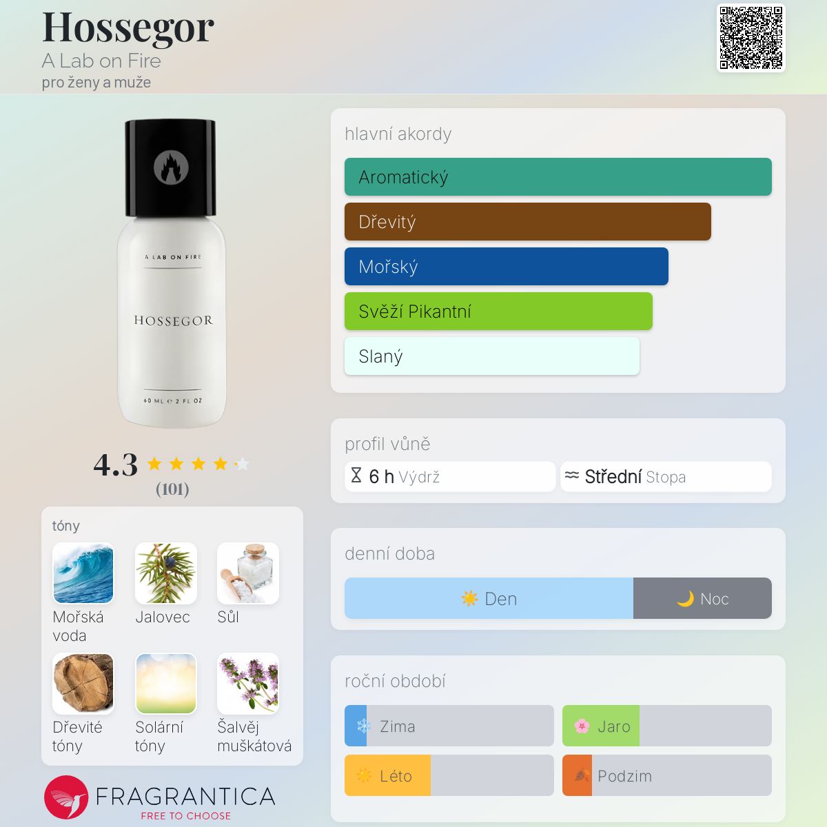 Hossegor podle A Lab on Fire je Woody Aromatic vůně pro ženy a muže. Hossegor byl/a uveden/a v roce 2018. "Nosem" za touto vůní je Mackenzie Reilly. Vrchní tóny jsou Jalovec, Mořská sůl, Černý pepř a Masticha; střední tóny jsouSolární tóny, Šalvěj muškátová, Orris a Olibanum ; základní tóny jsou Mořské tóny, Dřevité tóny, Ambra, Vetiver, Ambroxan a Pižmo.