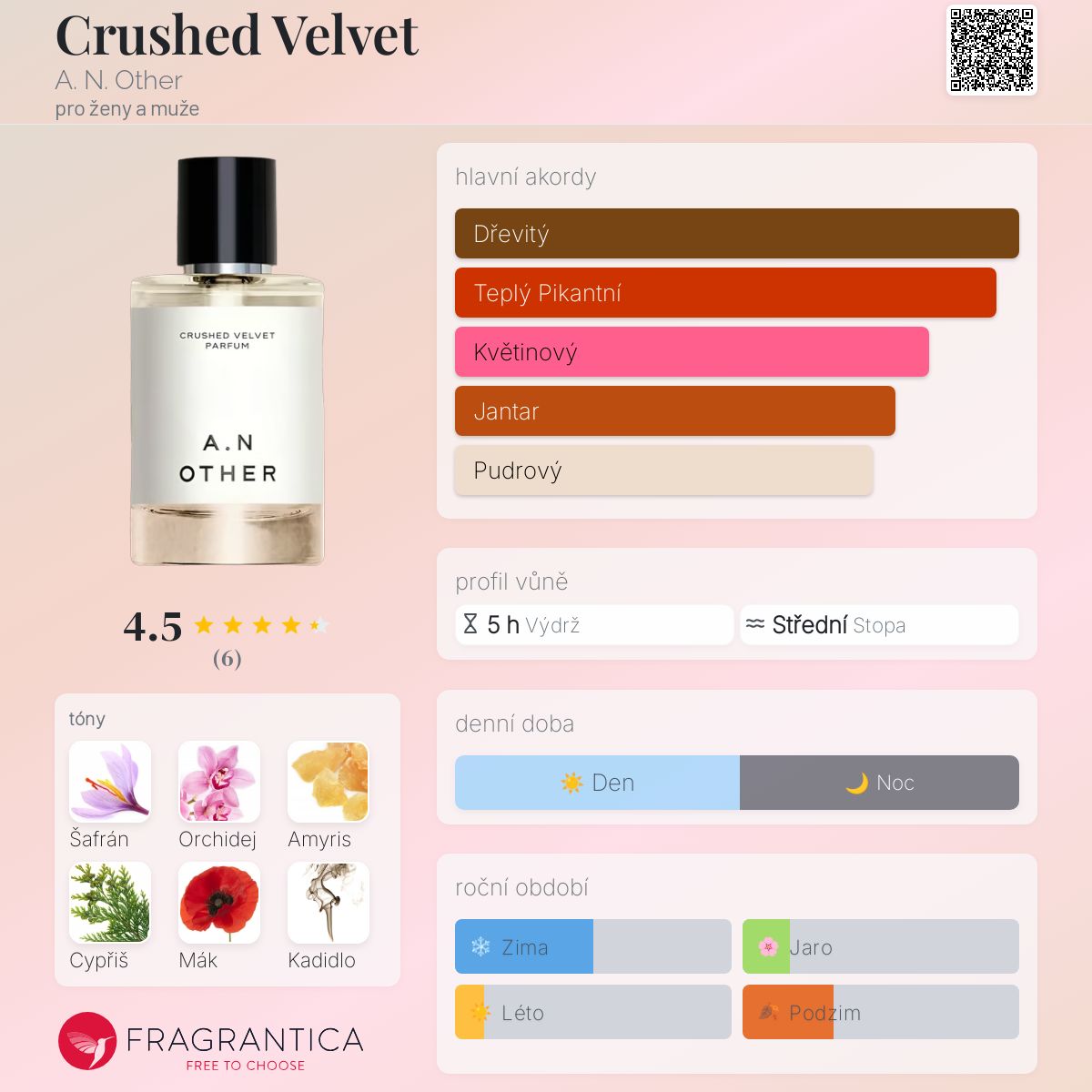 Crushed Velvet podle A. N. Other je Woody Spicy vůně pro ženy a muže. Toto je nová vůně. Crushed Velvet byl/a uveden/a v roce 2024. "Nosem" za touto vůní je Catherine Selig. Vrchní tóny jsou Šafrán, Amyris a Cypřiš; střední tóny jsouVanilková orchidej, Mák, Kadidlo a Kouř ; základní tóny jsou Kadidlo, Tělové pižmo a Santalové dřevo.