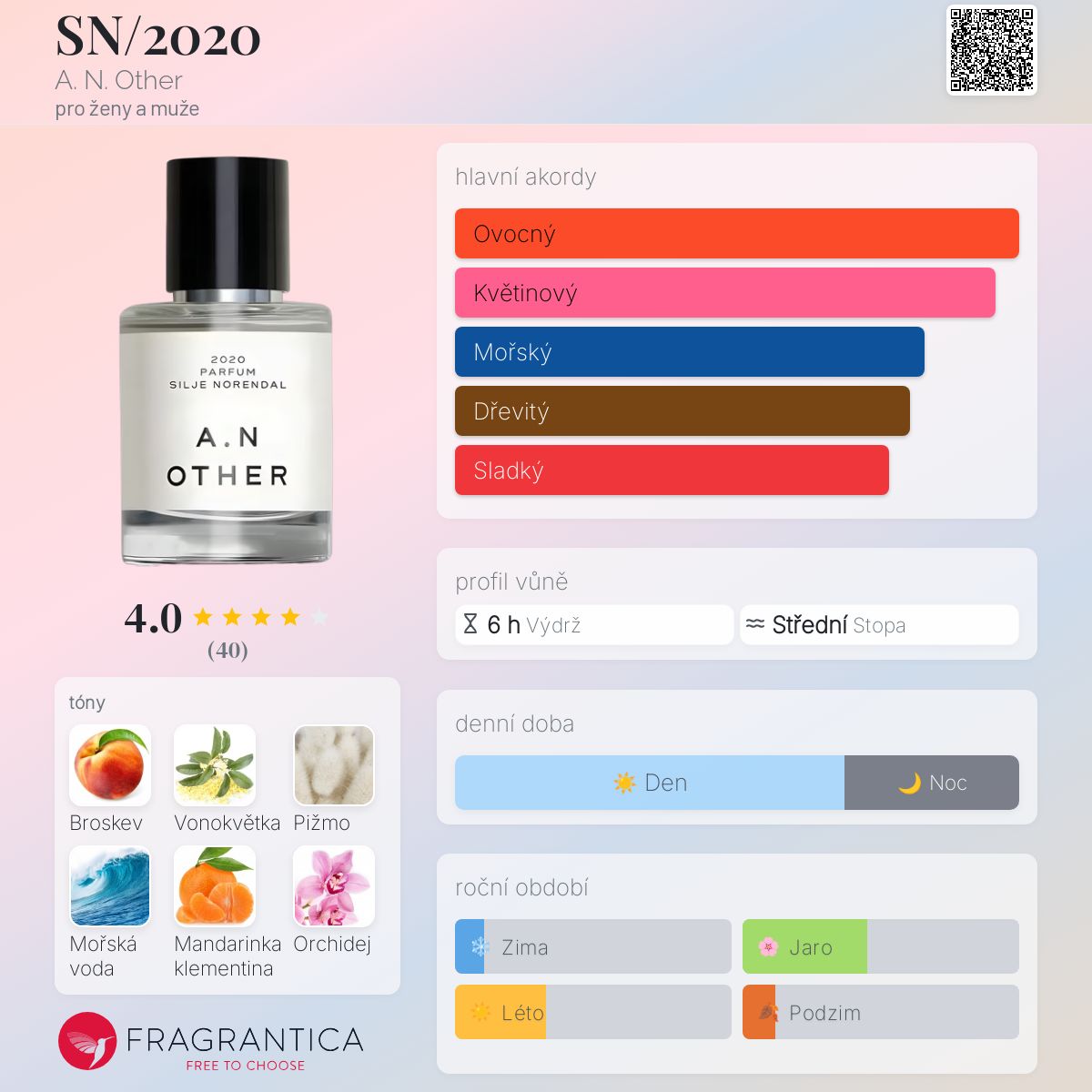 SN/2020 podle A. N. Other je Floral Woody Musk vůně pro ženy a muže. SN/2020 byl/a uveden/a v roce 2020. "Nosem" za touto vůní je Christine Hassan. Vrchní tóny jsou Broskev, Mořské tóny a Mandarinka klementina; střední tóny jsouVonokvětka, Orchidej a Tuberóza ; základní tóny jsou Pižmo, Bambus a Naplavené dříví.