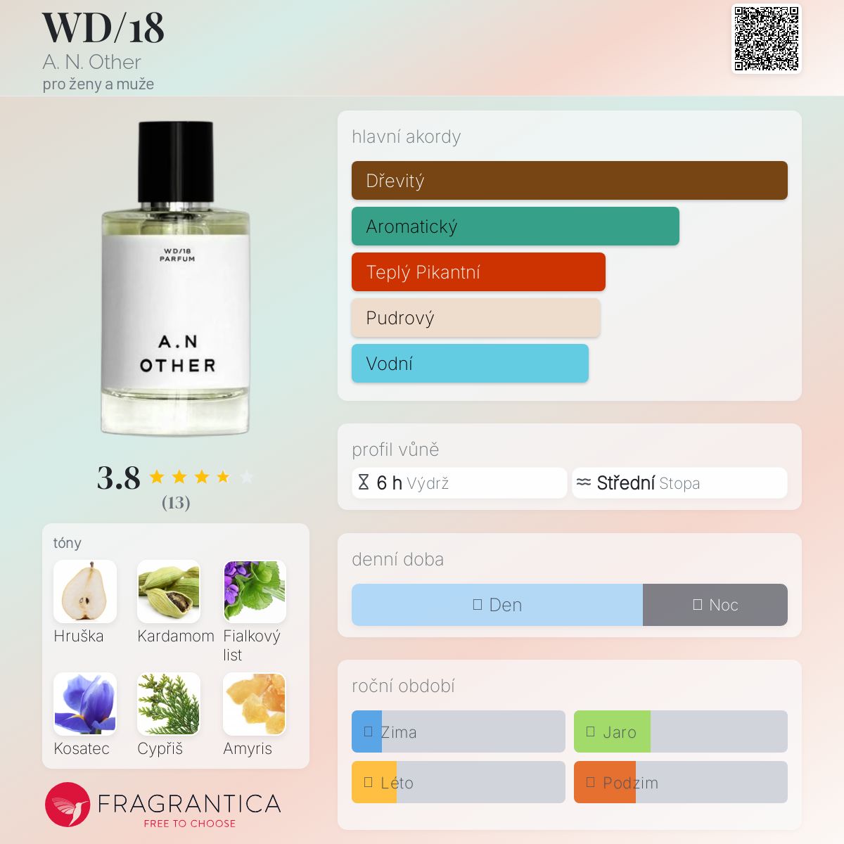 WD/18 podle A. N. Other je Woody Aromatic vůně pro ženy a muže. WD/18 byl/a uveden/a v roce 2017. "Nosem" za touto vůní je Patricia Bilodeau. Vrchní tóny jsou Hruška, Kardamom a Fialkový list; střední tóny jsouKosatec, Cypřiš a Amyris ; základní tóny jsou Santalové dřevo, Cedr a Madagaskarský vetiver.