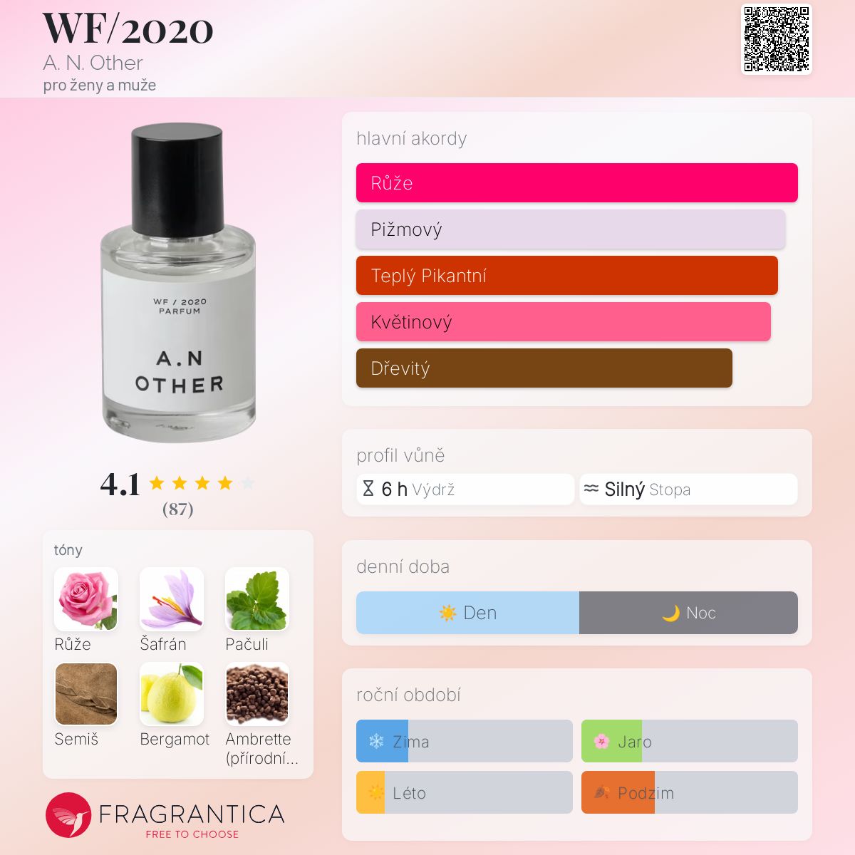 WF/2020 podle A. N. Other je Floral Woody Musk vůně pro ženy a muže. WF/2020 byl/a uveden/a v roce 2020. "Nosem" za touto vůní je Catherine Selig. Vrchní tóny jsou Šafrán, Bergamot a Ambrette (přírodní pižmo); střední tóny jsouRůže, Granátové jablko a Pivoňka ; základní tóny jsou Pačuli, Semiš a Pižmo.