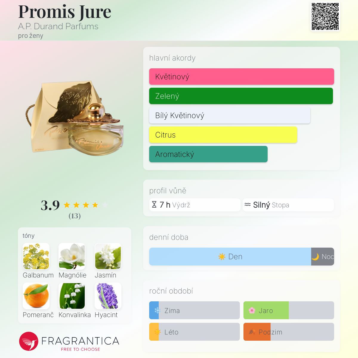 Promis Jure podle A.P. Durand Parfums je Floral Woody Musk vůně pro ženy. Vrchní tóny jsou Galbanum, Pomeranč, Bergamot, Estragon, Mandarinka a Černý rybíz; střední tóny jsouMagnólie, Jasmín, Konvalinka, Hyacint, Růže a Kosatec ; základní tóny jsou Vanilka, Jantar (ambra), Pižmo a Santalové dřevo.