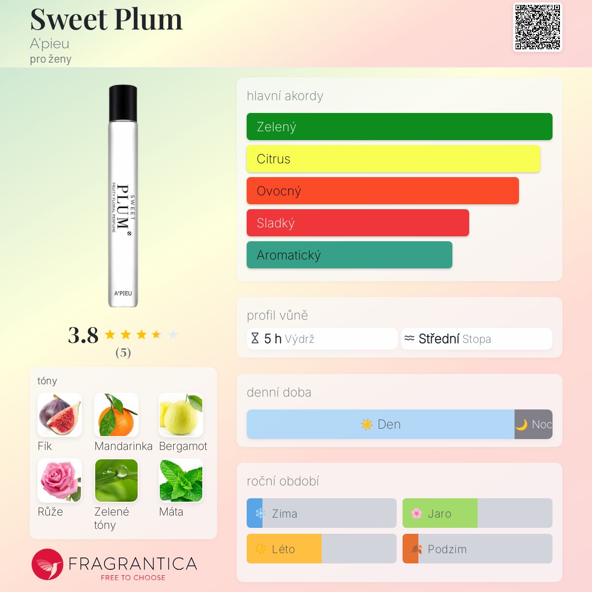 Sweet Plum podle A'pieu je Aromatic Fruity vůně pro ženy. Sweet Plum byl/a uveden/a v roce 2020. Vrchní tóny jsou Fík, Mandarinka a Bergamot; střední tóny jsouRůže, Zelené tóny a Máta peprná ; základní tón je Pižmo.