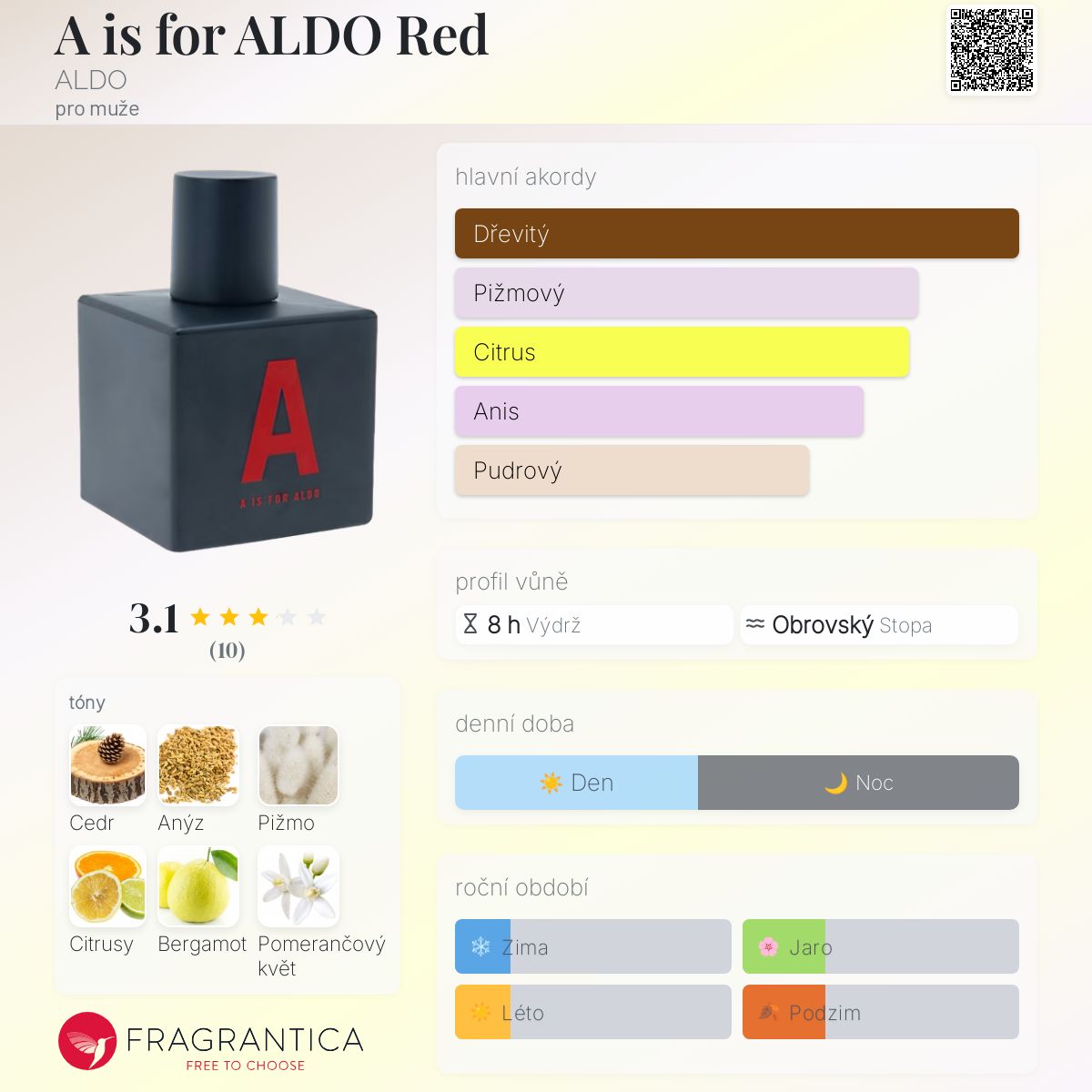 A is for ALDO Red podle ALDO je Orientální Woody vůně pro muže. A is for ALDO Red byl/a uveden/a v roce 2011. Vrchní tóny jsou Anýz, Citrusy a Bergamot; střední tóny jsouVirginský cedr a Květ afrického pomeranče ; základní tóny jsou Pižmo, Pačuli, Fazole tonka a Vanilka.