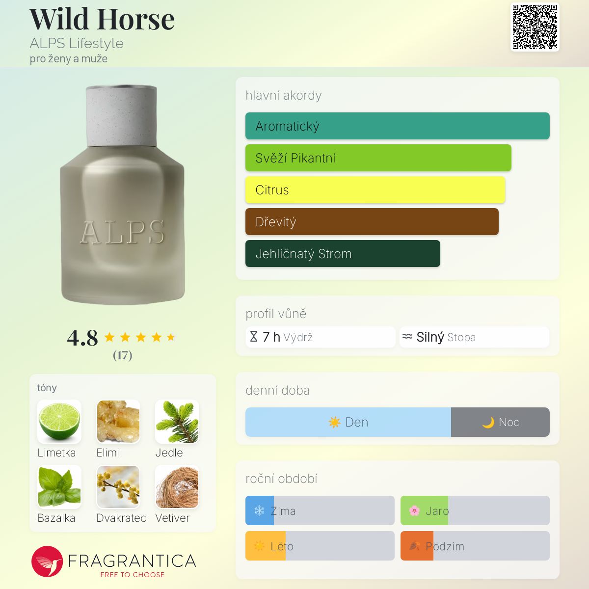 Wild Horse podle ALPS Lifestyle je vůně pro ženy a muže. Toto je nová vůně. Wild Horse byl/a uveden/a v roce 2024. Vrchní tóny jsou Limetka, Elimi, Jalovcové bobulky, Bergamot a Kardamom; střední tóny jsouJedle balzámová, Bazalka a Dvakratec ; základní tóny jsou Haitský vetiver, Dřevo akigala a Pačuli.