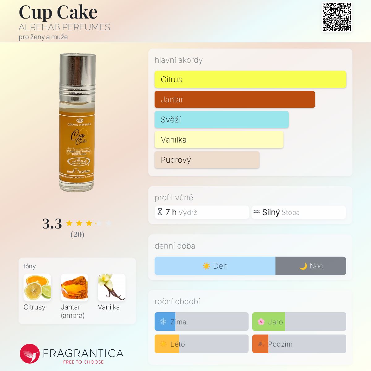 Cup Cake podle ALREHAB PERFUMES je vůně pro ženy a muže. Cup Cake byla spuštěna během 2020. Vrchní tóny jsou Citrusy a Jantar (ambra); střední tón jeVanilka ; základní tón je Vanilka.