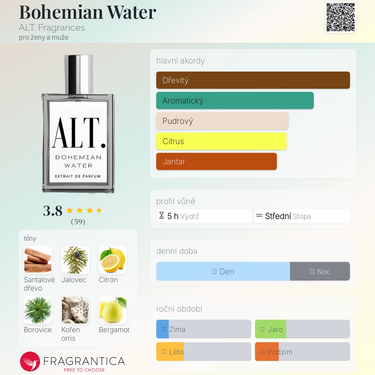 Bohemian Water podle ALT. Fragrances je Citrus vůně pro ženy a muže. Bohemian Water byl/a uveden/a v roce 2021. Vrchní tóny jsou Jalovec, Citrón a Bergamot; střední tóny jsouJehličí borovice, Kořen orris a Kadidlo ; základní tóny jsou Santalové dřevo, Jantar (ambra) a Vanilka.